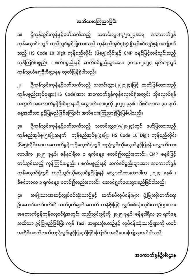 ယခင် ပို့ကုန်သွင်းကုန်နှင့် ပတ်သက်သည့် သတင်းလွှာ (၂/၂၀၂၄)ဖြင့် ထုတ်ပြန်ထားသည့် ကုန်ပစ္စည်းအုပ်စုများ (HS Code) အား အကောက်ခွန်ကုန်လှောင်ရုံအတွင်း သိုလှောင်ရန်အတွက် အကောက်ခွန်ဦးစီးဌာနသို့ လျှောက်ထားမှုကို ၂၀၂၄ ခုနှစ်၊ ဒီဇင်ဘာလ ၃၁ ရက်အထိသာ ခွင့်ပြုမည်ဖြစ်ကြောင်း အသိပေးကြေညာခဲ့ပြီးဖြစ်သည်။