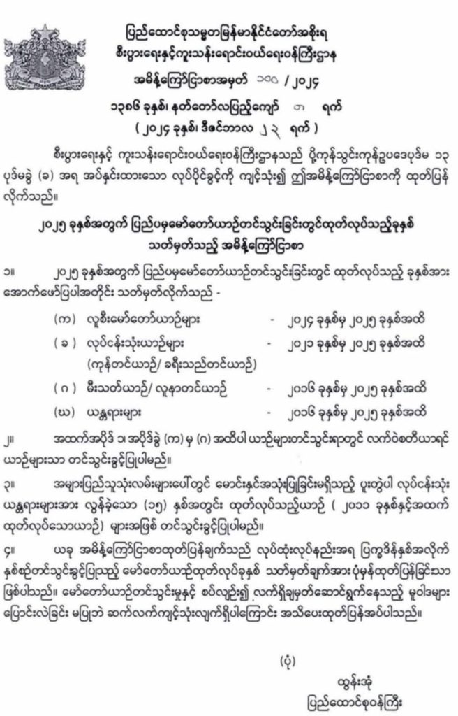ယခု အမိန့်ကြော်ငြာစာထုတ်ပြန်ချက်သည် လုပ်ထုံးလုပ်နည်းအရ ပြက္ခဒိန်နှစ်အလိုက် နှစ်စဉ်တင်သွင်းခွင့်ပြုသည့် မော်တော်ယာဉ်ထုတ်လုပ်ခုနှစ် သတ်မှတ်ချက်အား ပုံမှန်ထုတ်ပြန်ခြင်းသာဖြစ်ပြီး မော်တော်ယာဉ်တင်သွင်းမှုနှင့် စပ်လျဉ်း၍ လက်ရှိချမှတ်ဆောင်ရွက်နေသည့် မူဝါဒများ ပြောင်းလဲခြင်းမပြုဘဲ ဆက်လက်ကျင့်သုံးလျက်ရှိကြောင်း အသိပေးထုတ်ပြန်ထားသည်။