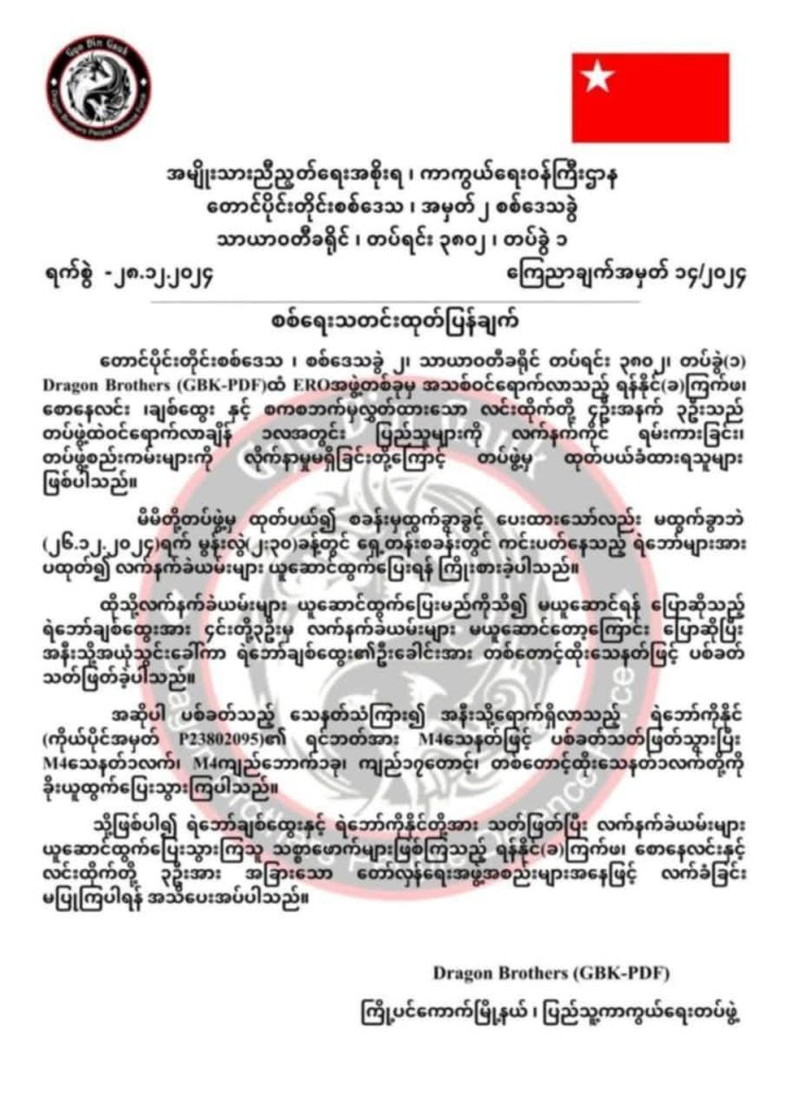 ထို့ကြောင့် ရဲဘော်ချစ်ထွေးနှင့် ရဲဘော်ကိုနိုင်တို့အား သတ်ဖြတ်ပြီး လက်နက်ခဲယမ်းများ ယူဆောင်ထွက်ပြေးသွားကြသူ ရန်နိုင်(ခ)ကြက်ဖ၊ စောနေလင်းနှင့် လင်းထိုက်တို့ ၃ ဦးအား အခြားသော တော်လှန်ရေးအဖွဲ့အစည်းများ လက်ခံခြင်းမပြုကြရန် အသိပေးအပ်ကြောင်းလည်း GBK – PDF က ထုတ်ပြန်တောင်းဆိုထားသည်။
