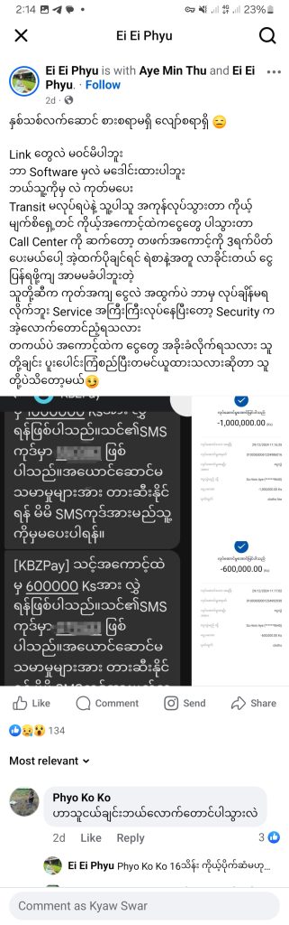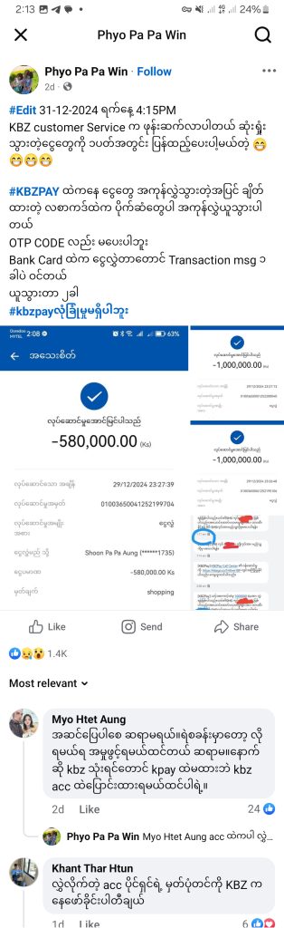 ယခုရက်ပိုင်းအတွင်း လူမှုကွန်ရက်တွင် KBZ Pay အကောင့်အသုံးပြုသူများ၏ အကောင့်အတွင်း ဝင်ရောက်၍ အကောင့်ပိုင်ရှင်မသိမီ ကျပ်သိန်းဆယ်ချီကို လိမ်လည်သူများက လွှဲပြောင်းရယူသွားမှုဖြစ်စဥ်များနှင့် ပတ်သက်