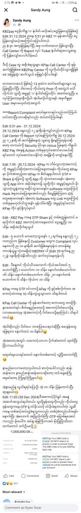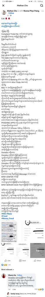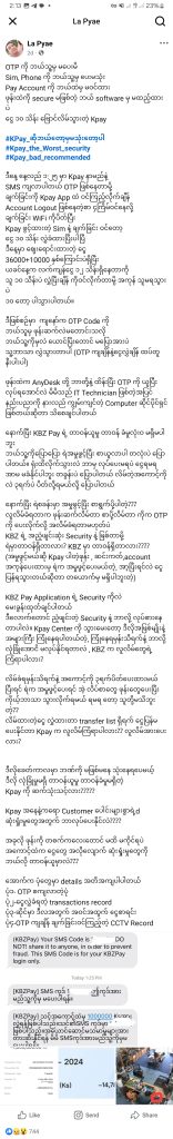 ပုံစာ။ ယခုရက်ပိုင်းအတွင်း K Pay အသုံးပြုသူအချို့ လိမ်လည်မှုဖြစ်စဥ်အကြောင်း Facebook ပေါ်၌ Public ဖြင့် ရေးသားချက်အချို့ တွေ့ရစဥ်။
