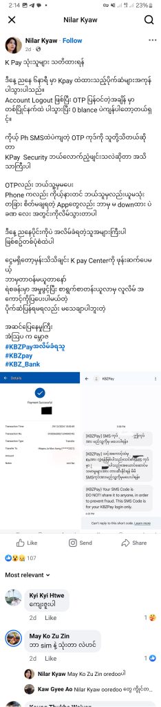 “လတ်တလောတွင် အသုံးပြုသူအချို့၏ အကောင့်များသို့ OTP ကို ရယူပြီး PIN နံပါတ် ကို ခန့်မှန်းကာ ဝင်ရောက်သည့် ဖြစ်စဉ်များနှင့် ပတ်သက်ပြီး ကမ္ဘောဇဘဏ်မှ သိရှိသတိပြုမိထားပြီး ဖြစ်ကြောင်းနှင့် အသုံးပြုသူများ ငွေကြေးဆုံးရှုံးမှု မဖြစ်ပေါ်စေရေးအတွက် ကမ္ဘောဇဘဏ်မှ တာဝန်ယူမှု၊ တာဝန်ခံမှု အပြည့်ဖြင့် အကောင်းဆုံး ဝန်ဆောင်မှု ပေးလျက်ရှိကြောင်း အသိပေးအပ်ပါသည်။ ယခုဖြစ်စဉ်များကိုလည်း အမြန်ဆုံး စိစစ်ဆောင်ရွက်နေပြီး မြန်မာနိုင်ငံတော် ဗဟိုဘဏ်၏ ကြီးကြပ်လမ်းညွှန်မှု နှင့်အတူ စုံစမ်းထုတ်ဖော်သွားမည် ဖြစ်ပါသည်”ဟုလည်း KBZ Pay က ပြောသည်။
