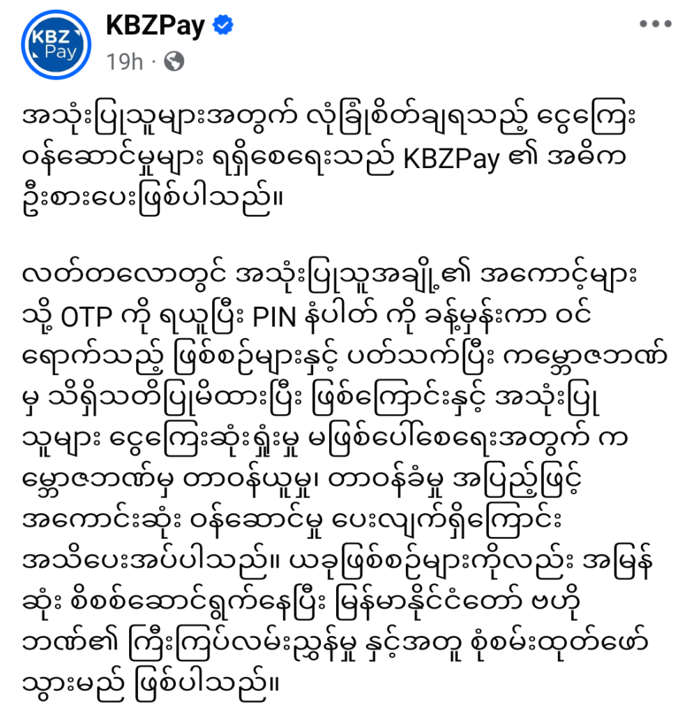 သုံးစွဲသူ၏ မှားယွင်းမှုနှင့် ဆောင်ရွက်ချက် တစ်စုံတစ်ရာကြောင့်မဟုတ်ဘဲ OTP နံပါတ်များ၊ လုံခြုံရေးနံပါတ် (Password) များနှင့် ကိုယ်ရေးအချက်အလက်များအား အခြားနည်းလမ်းဖြင့် ရရှိခြင်းကြောင့်ဖြစ်ပွားသည့် လိမ်လည်မှုဖြစ်စဉ်များအတွက် ဆုံးရှုံးမှုများဖြစ်ပေါ်လာပါက သုံးစွဲသူများ ဆုံးရှုံးမှုမရှိစေရေးနှင့် အရေးယူနိုင်ရေးအတွက် တာဝန်ရှိသူများအနေဖြင့် ပူးပေါင်းစိစစ်ဖော်ထုတ်လျက်ရှိသည်ဟု မြန်မာနိုင်ငံတော်ဗဟိုဘဏ်က အသိပေးထားသည်။