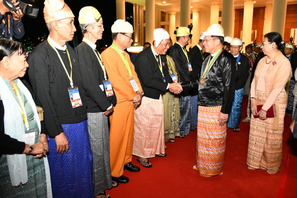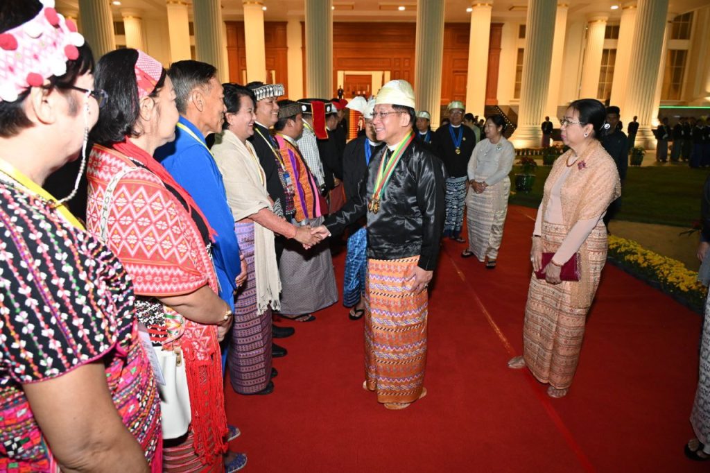 SAC ဥက္ကဋ္ဌနှင့် ဇနီးဒေါ်ကြူကြူလှတို့သည် ဂုဏ်ပြုဆောင်ခန်းမ ဥပစာမြက်ခင်းပြင်သို့ ရောက်ရှိကြပြီး SAC ဒုတိယဥက္ကဋ္ဌနှင့် ဇနီးတို့နှင့်အတူ ဂုဏ်ပြုညစာစားပွဲအခမ်းအနားသို့ တက်ရောက်လာကြသည့် နိုင်ငံရေးပါတီများမှ ဥက္ကဋ္ဌများနှင့် ကိုယ်စားလှယ်များ၊ နိုင်ငံခြားသံရုံးများမှ သံအမတ်ကြီးများနှင့် သံရုံးတာဝန်ခံများ၊ ဂုဏ်ထူးဆောင်ကောင်စစ်ဝန်များနှင့် အထူးဖိတ်ကြားထားသည့် ဧည့်သည်တော်များကို ရင်းရင်းနှီးနှီးနှုတ်ဆက်သည်။