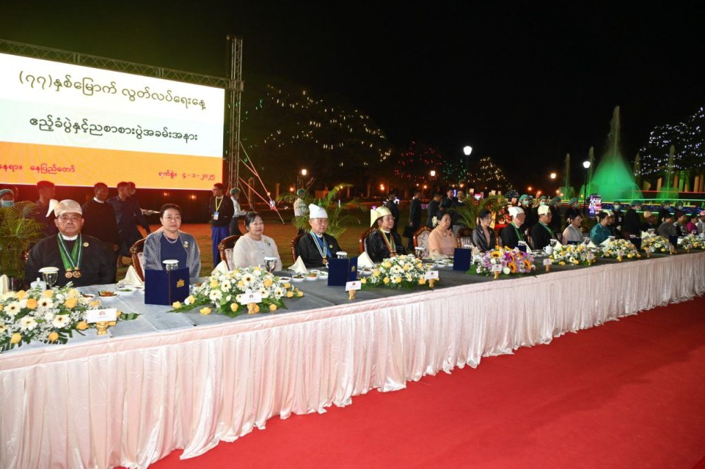 ၇၇ နှစ်မြောက် လွတ်လပ်ရေးနေ့အထိမ်းအမှတ် ဂုဏ်ပြုညစာစားပွဲနှင့် ဂုဏ်ပြုဖျော်ဖြေပွဲ အခမ်းအနားကို ယမန်နေ့ ညနေပိုင်းတွင် နေပြည်တော်ရှိ နိုင်ငံတော်စီမံအုပ်ချုပ်ရေးကောင်စီ ဥက္ကဋ္ဌရုံး၊ ဥပစာမြက်ခင်းပြင်၌ ကျင်းပခဲ့ရာ နိုင်ငံတော်စီမံအုပ်ချုပ်ရေးကောင်စီ (SAC) ဥက္ကဋ္ဌ ဗိုလ်ချုပ်မှူးကြီးမင်းအောင်လှိုင်နှင့် ဇနီး ဒေါ်ကြူကြူလှတို့ တက်ရောက်ခဲ့သည်။