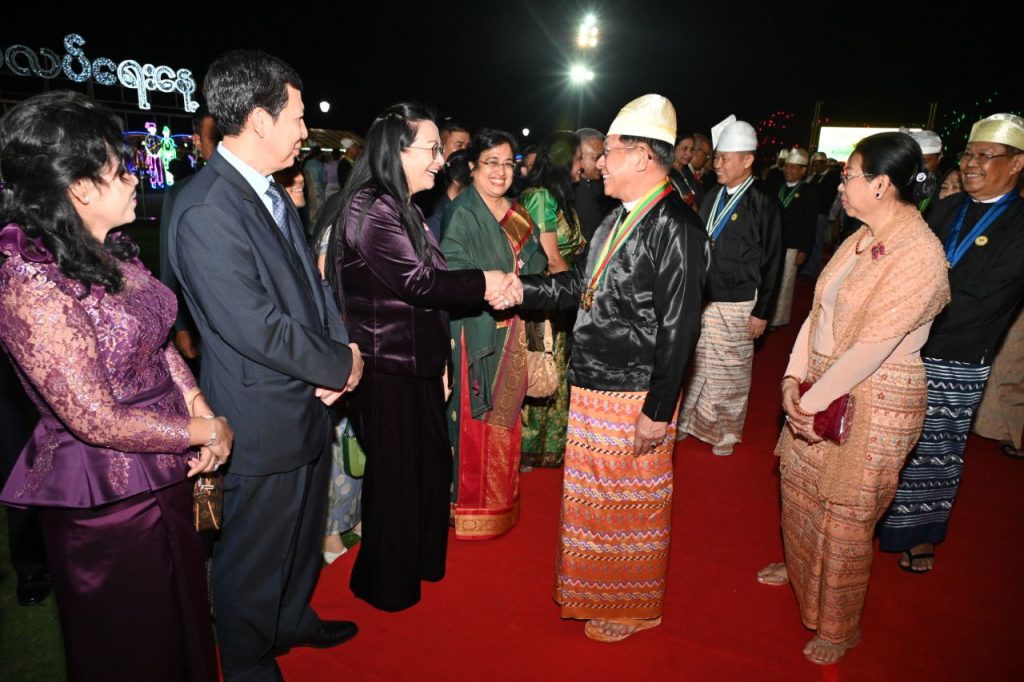 ပဒေသာကပွဲအပြီးတွင် SAC ဥက္ကဋ္ဌနှင့် ဇနီးတို့သည် ဖျော်ဖြေတင်ဆက်ခဲ့ကြသည့် ပြန်ကြားရေးဝန်ကြီးဌာန မြန်မာ့အသံနှင့်ရုပ်မြင်သံကြားနှင့် သာသနာရေးနှင့် ယဉ်ကျေးမှုဝန်ကြီးဌာ၊ အနုပညာ ဦးစီးဌာနတို့မှ တေးသံရှင်များနှင့် အနုပညာရှင်များကို ဂုဏ်ပြုပန်းခြင်းပေးအပ်ပြီး ဂုဏ်ပြုညစာစားပွဲ အခမ်းအနားသို့ တက်ရောက်လာကြသူများကို ရင်းရင်းနှီးနှီး နှုတ်ဆက်ခဲ့သည်။