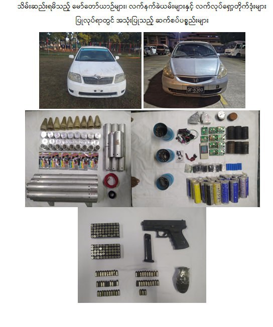 ဖမ်းဆီးရမိတရားခံ ဝင်းခန့်ကိုကို(ခ)ငှက်ကလေး(ခ)ရှိုင်းဝဏ္ဏ(ခ)အောင်ဇေယျ၏ ထွက်ဆို ချက်အရ ၎င်းတို့အကြမ်းဖက်အဖွဲ့ဝင်ဖြစ်သည့် မင်းစံ(ခ)မျိုးဦး(ဖမ်းမမိ)နေထိုင်သည့် လှိုင်သာယာ (အနောက်ပိုင်း)မြို့နယ်၊ အမှတ်(၉)ရပ်ကွက်၊ ချောင်းဦးလမ်း၊ အမှတ်(၃၃၃/က)နေအိမ်မှ အနက်ရောင် ၇၉ ဗုံးပစ်လောင်ချာ ၂ လက်၊ အနက်ရောင် M 16 မောင်းပြန်ရိုင်ဖယ် သေနတ် ၁ လက်၊ ၎င်းကျည်အိမ် ၁ ခု၊ ၄ဝ မမကျည် ၅ တောင့်၊ လက်လုပ်ဗုံးပြုလုပ်ရာတွင် အသုံးပြုသည့် ဆားကစ်ပြား ၅ဝဝ ခု၊ နီ/နက်အရောင် အဖွင့်အပိတ်ခလုတ် ၁ဝဝ ခု၊ Panasonic စာတမ်းပါ ဓာတ်ခဲခြောက် ၁ဝ လုံးစီပါ စက္ကူဖာ ၃ဝ ဖာ၊ PVC စာတမ်းပါ ဝါယာကြိုးခွေ ၅ ခွေ၊ ဝါယာကြိုးပါ ဓာတ်ခဲခြောက်နှင့်တွဲသည့် ကတ်သီး ၃ဝဝ ခု၊ ဒီတိုနေတာ ၂ဝ ချောင်း၊ ယမ်းကြိုးခွေ ၁ ခွေ၊ မီတာထောက်ကိရိယာ ၂ ခု၊ ကော်အရည်ဖျော် Gun ၁ ခု၊ Remote မျိုးစုံ ၃ ခု၊ အပြာရောင် PVC ပိုက်ဖြင့် ပြုလုပ်ထားသော လက်လုပ်ဗုံး ၁ လုံး၊ Keypad ဖုန်း ၂ လုံး၊ ဓာတ်ခဲအားသွင်းစက် ၁ ခု၊ ဘတ္ထရီ စက်ဘီးအားသွင်းကြိုး ၁ စုံ၊ သံပိုက်ဖြင့် ပြုလုပ်ထားသာ လက်လုပ်ဗုံး ၂ လုံး၊ လက်လုပ်ဗုံးပြုလုပ် ရာတွင် အသုံးပြုသည့် သံတိုသံစ ၁ ဖာ၊ မီးတိပ်မျိုးစုံ ၁၇ ခွေ၊ 9 mm Thai Arms ပစ္စတိုကျည် ၉၆ တောင့်၊ 380 Auto USA -A ပစ္စတိုကျည် ၄၈ တောင့်၊ 380 Auto Thai Arms ပစ္စတိုကျည် ၁၃ တောင့်တို့ကို သိမ်းဆည်းရမိခဲ့သည်။
