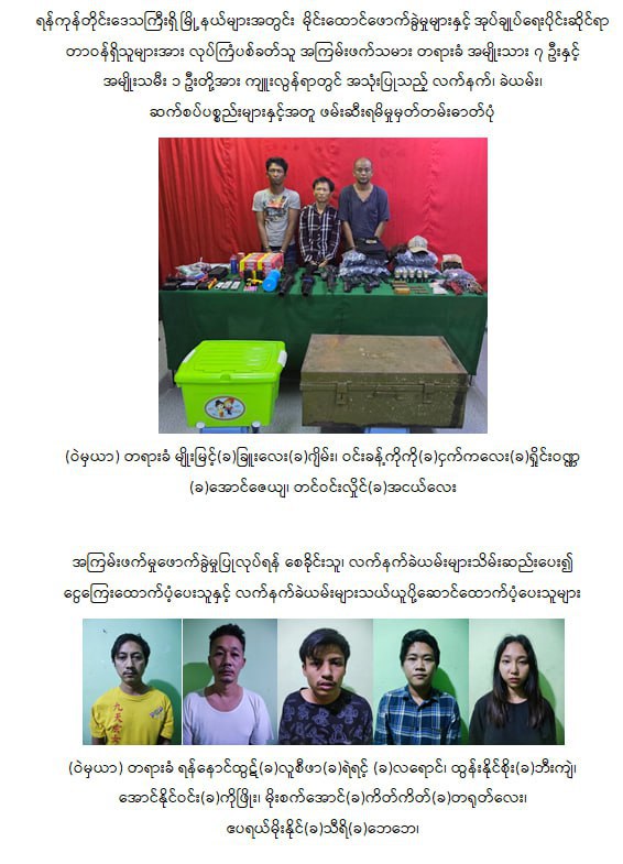 ဖြစ်စဉ်တွင် ရန်ကုန်တိုင်းဒေသကြီးရှိ မြို့နယ်များအတွင်း မိုင်းထောင်ဖောက်ခွဲတိုက်ခိုက်မှုနှင့် အကြမ်းဖက်လုပ်ကြံပစ်ခတ်မှုများ ကျူးလွန်ခဲ့သူများဖြစ်ကြသည့် မြို့ပြကြွက်အမည်ခံ UG PDF များဖြစ်သည့် ရန်နောင်ထွဋ်(ခ)လူစီဖာ(ခ)ရဲရင့် (ခ)လရောင်၊ ထွန်းနိုင်စိုး(ခ)ဘီးကျဲ၊ မိုးစက်အောင်(ခ)ကိတ်ကိတ်(ခ)တရုတ်လေး၊ အောင်နိုင်ဝင်း(ခ) ကိုဖြိုး၊ ဧပရယ်မိုးနိုင်(ခ)သီရိ(ခ)ဘေဘေ၊ ဝင်းခန့်ကိုကို(ခ)ငှက်ကလေး(ခ)ရှိုင်းဝဏ္ဏ(ခ)အောင်ဇေယျ၊ တင်ဝင်းလှိုင်(ခ)အငယ်လေးနှင့် မျိုးမြင့်(ခ)ခြူးလေး(ခ)ဂျိမ်းတို့ ၈ ဦးအား ပြစ်မှုများကျူးလွန်စဉ် အသုံးပြုခဲ့သည့် မော်တော်ယာဉ် ၂ စီး၊ လက်နက်မျိုးစုံ ၆ လက်နှင့် ခဲယမ်းများ၊ အကြမ်းဖက် ဖောက်ခွဲမှုနှင့် လက်လုပ်ရှော့တိုက်ဒုံးများပြုလုပ်ရန် ပြင်ဆင်ထားသည့် ဆက်စပ်ပစ္စည်းများနှင့် အတူ ဖမ်းဆီးရမိခဲ့ပြီး ၎င်းတို့ ကျူးလွန်ခဲ့သော ပြစ်မှုများအတိုင်း ထိရောက်စွာ အရေးယူနိုင်ရေး ဥပဒေနှင့်အညီ ဆက်လက် ဆောင်ရွက်သွားမည်ဖြစ်ကာ အကြမ်းဖက်မှုပြုလုပ်နေသူများအား ပြည်သူတစ်ရပ်လုံးက ဝိုင်းဝန်း ကာကွယ်တိုက်ဖျက်ကြရန်နှင့် ဖမ်းဆီးရန်ကျန်တရားခံများအား အမြန်ဆုံးဆက်လက်ဖမ်းဆီးရမိရေး အတွက် ၎င်းတို့ ပုန်းခိုရာနေရာများ၊ လှုပ်ရှားသွားလာနေထိုင်မှု သတင်းများရရှိပါက သက်ဆိုင်ရာသို့ လျှို့ဝှက်စွာ သတင်းပေးတိုင်ကြားနိုင်ကြောင်းနှင့် မြို့၊ ရွာများ အမြန်ဆုံးအေးချမ်းတည်ငြိမ်ရေး အတွက် ပြည်သူတစ်ရပ်လုံး ပူးပေါင်းပါဝင်ကြိုးပမ်းဆောင် ရွက်နိုင်ပါရန် မေတ္တာရပ်ခံအပ်ပါကြောင်း အသိပေးသတင်းထုတ်ပြန်ထားသည်။