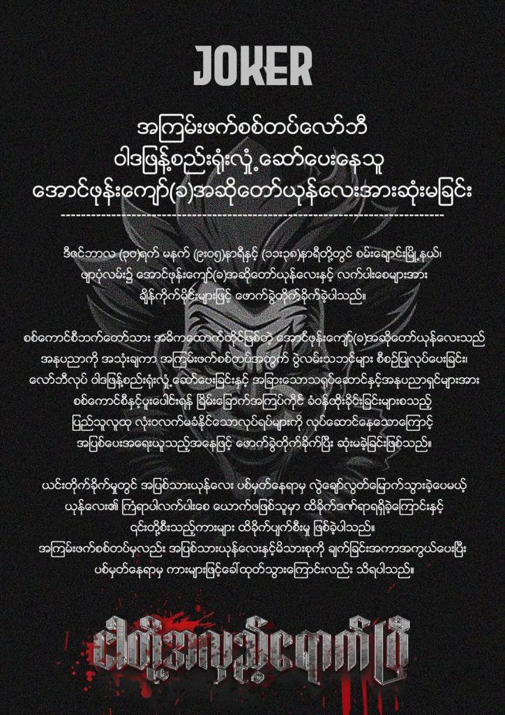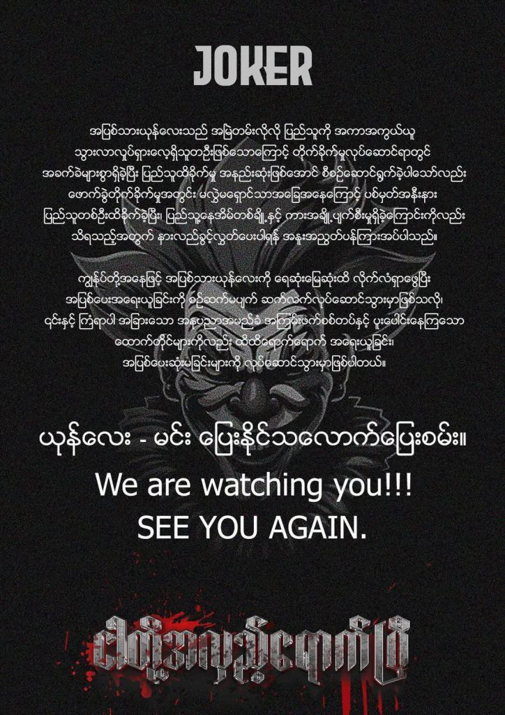 အကြမ်းဖက်သမားများသည် ၂၀၂၄ ခုနှစ်၊ စက်တင်ဘာလ ၂၆ ရက်နေ့ ညပိုင်းတွင် ရန်ကုန်တိုင်းဒေသကြီး၊ အင်းစိန်မြို့နယ်၊ အောင်ဆန်းရပ်ကွက်၊ အောက်မင်္ဂလာဒုံလမ်း၊ အောင်ဆန်းဈေးရှေ့ရှိ လမ်းဘေးအသုတ်ဆိုင်၌ ထိုင်နေသည့် အဆိုပါရပ်ကွက်နေ ရာအိမ်မှူးဖြစ်သူ ဦးဇော်မင်းထွန်း (၅၂)နှစ်အား သေနတ်ဖြင့် လုပ်ကြံပစ်ခတ်ခြင်း၊ ဒီဇင်ဘာလ ၅ ရက်နေ့ နံနက်ပိုင်းတွင် လှိုင်သာယာ (အနောက်ပိုင်း)မြို့နယ်၊ အမှတ်(၉)ရပ်ကွက်၊ မကွေးလမ်းနှင့် ရွှေဝတ်မှုံလမ်းဆုံ၌ အမှတ်(၁၁) ရပ်ကွက်အုပ်ချုပ်ရေးမှူးဖြစ်သူ ဦးတင်ဇော်ဦးနှင့် ဇနီးတို့အား ပစ်ခတ်သတ်ဖြတ်ခြင်းစသည့် အကြမ်းဖက်လုပ်ရပ်များကိုလည်းကောင်း၊ ဒီဇင်ဘာလ ၃၀ ရက်နေ့ နံနက်ပိုင်းတွင် စမ်းချောင်း မြို့နယ်၊ ကျွန်းတော(အလယ်)ရပ်ကွက်၊ ဖျာပုံလမ်း၊ အိမ်အမှတ်(၃၁)၊ ပန်းလှိုင်မိသားစုဆေးခန်းရှေ့ရှိ Generator မီးစက်အသေး ၂ လုံးအနီး၌ အဆိုတော်သရုပ်ဆောင်ယုန်လေးကို လုပ်ကြံရန်ကြိုးစားမှုအဖြစ် မိုင်းထောင်ဖောက်ခွဲမှုကြောင့် အပြစ်မဲ့ပြည်သူများ၏ မော်တော်ယာဉ်(၆)စီးနှင့် နေအိမ်သုံးမီးစက် ၂ လုံး၊ စီးပွားရေးလုပ်ငန်းအသုံးပြုသည့် ဆိုင်းဘုတ်များ ပျက်စီးဆုံးရှုံးခဲ့ရသည့် ဖြစ်စဉ်များ ဖြစ်ပွားခဲ့သည်။