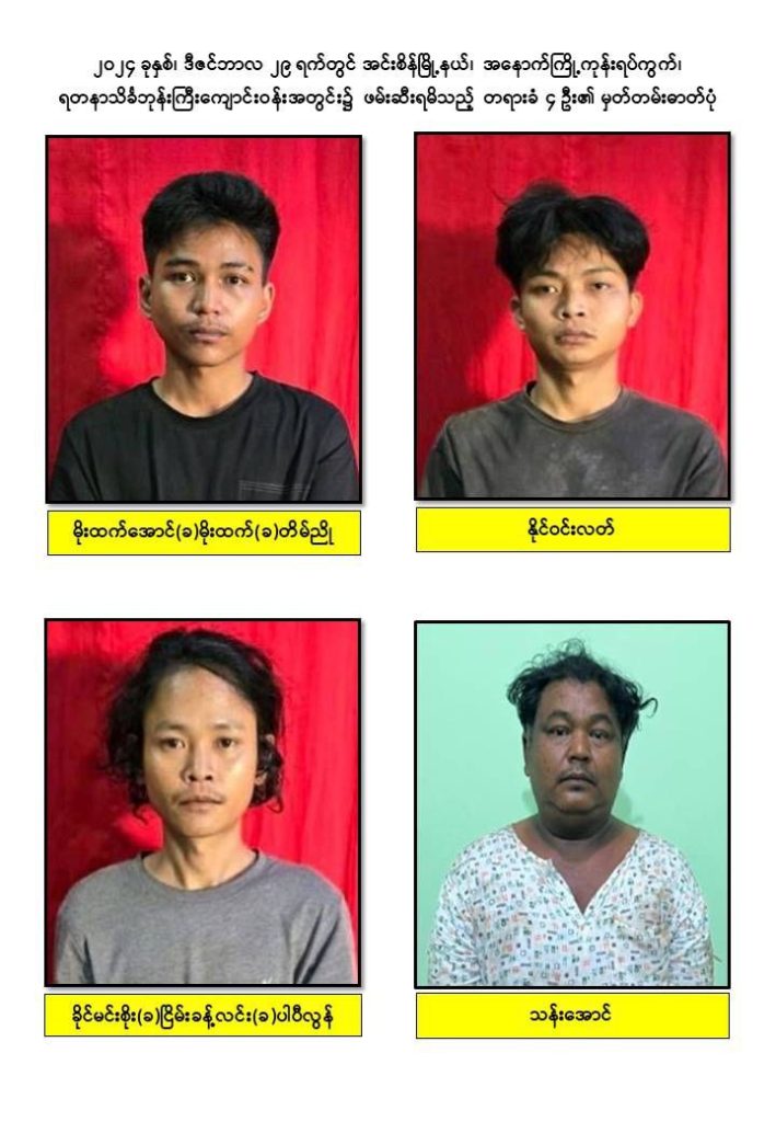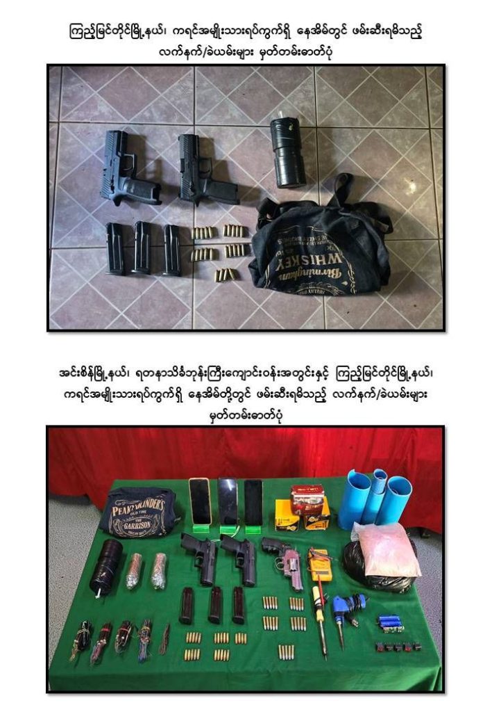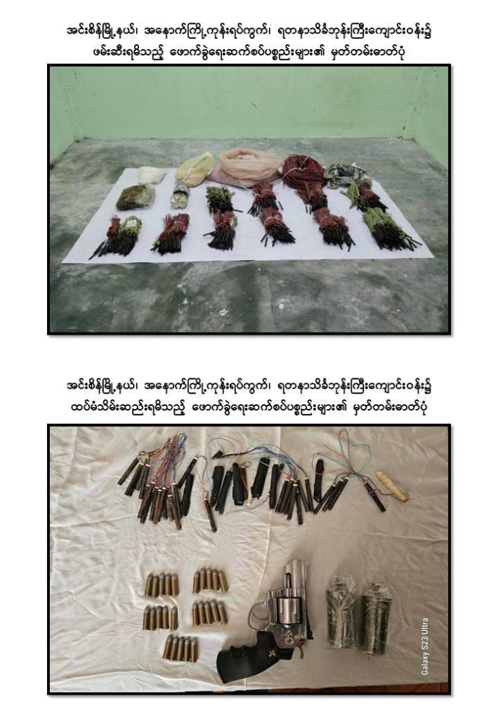 ဖြစ်စဉ်တွင် ရန်ကုန်တိုင်းဒေသကြီးအတွင်း အကြမ်းဖက်လုပ်ငန်းများ ဆောင်ရွက်လျက် ရှိသည့် တရားခံ ကျား ၅ ဦး၊ မ ၂ ဦး၊ စုစုပေါင်း ၇ ဦးတို့အား Sig Sauer ပစ္စတို သေနတ် ၂ လက်၊ ၎င်းကျည်အိမ် ၃ ခု၊ 9mm ကျည် ၂၄ တောင့်၊ ပွိုင့် 38 Special အမျိုးအစား ခြောက်လုံးပြူးသေနတ် ၁ လက်၊ ၎င်းကျည် ၂၅ တောင့်၊ လက်လုပ်ဗုံး ၂ လုံး၊ TNT ယမ်းတောင့် ၂ တောင့်၊ ဒီတိုနေတာ ၅၃၅ ချောင်း၊ ယမ်းမှုန့် ၃ ပိဿာ ၅၀ ကျပ်သား၊ နိုက်ထရိုကလယ်ဇင်း ၅၀ ကျပ်သား၊ ပုလဲ ၅၀ ပိဿာ၊ Black Powder ၂၀ ကျပ်သား၊ ယမ်းကြိုး(၂၀၀ ပေ) ၁ ခွေ၊ ဖောက်ခွဲရေးဆက်စပ်ပစ္စည်းများနှင့် အတူ ဖမ်းဆီးရမိခဲ့သည်။