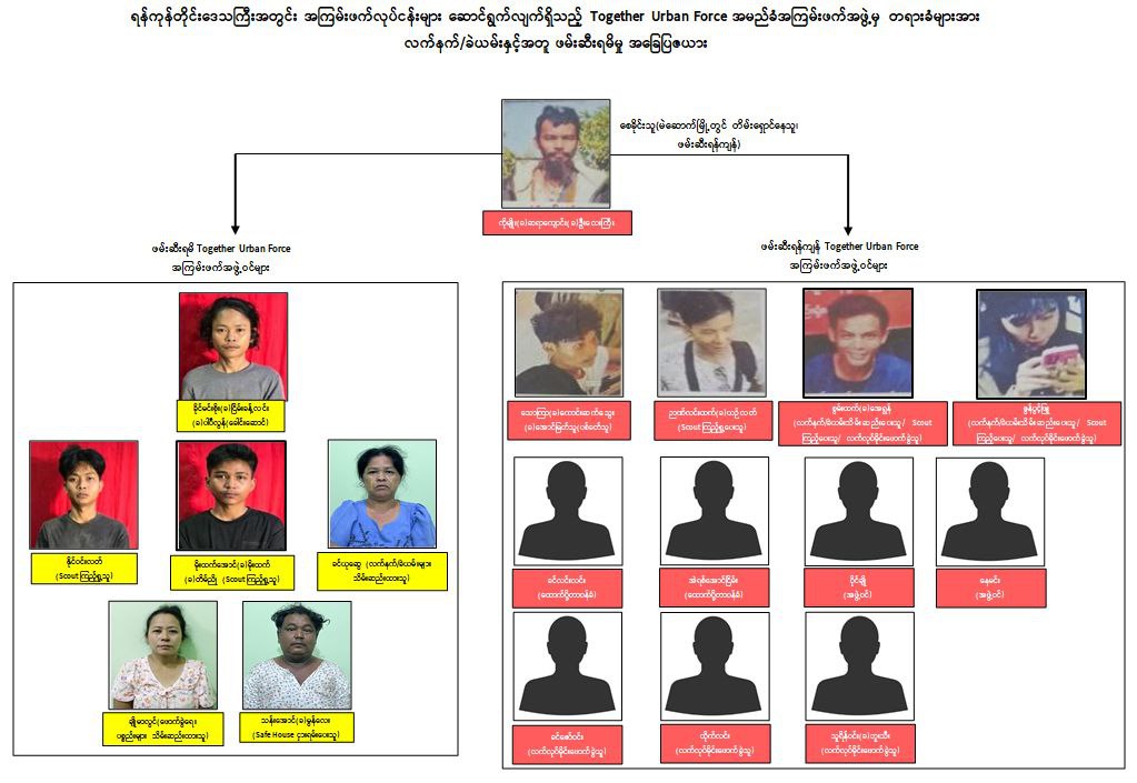 စရဖမှ ဗိုလ်မှူးမောင်နှမကို လုပ်ကြံမှုအပြင် ရပ်ကျေးအုပ်ချုပ်ရေးမှူးတစ်ဦးကိုသတ်ဖြတ်ရန်ကြိုးစားမှု၊ 29 ရတနာရွှေဆိုင်ဖောက်ခွဲမှုအပါအဝင် ရန်ကုန်တိုင်းဒေသကြီးအတွင်း အကြမ်းဖက်လုပ်ငန်းများဆောင်ရွက်လျက်ရှိသော Together Urban Force အဖွဲ့မှ တရားခံများအား လက်နက်/ခဲယမ်းများနှင့်အတူ ဖမ်းမိခဲ့ပြီဖြစ်ကြောင်း သိရသည်။
