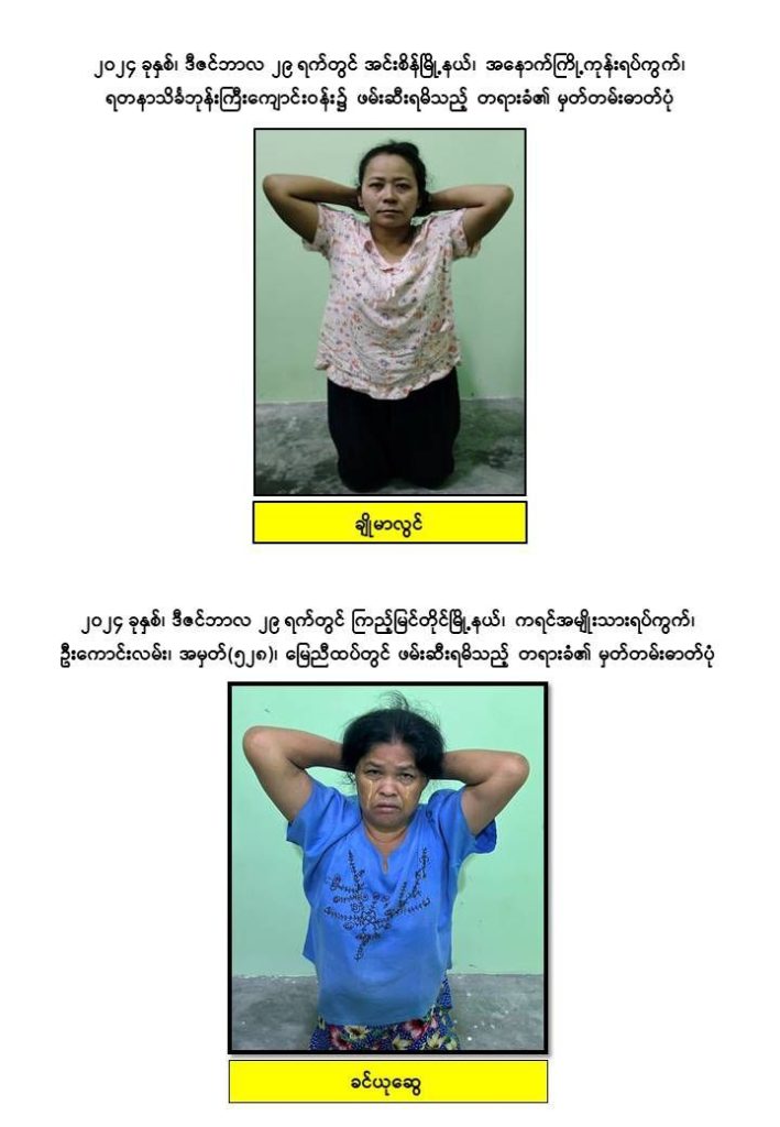 သို့ဖြစ်၍ ဖမ်းဆီးရမိတရားခံများအား ဥပဒေအရထိရောက်စွာအရေးယူနိုင်ရေး ဆက်လက် ဆောင်ရွက်သွားမည်ဖြစ်ပြီး အကြမ်းဖက်မှုဆောင်ရွက်နေသူများအား ပြည်သူတစ်ရပ်လုံးက ဝိုင်းဝန်း ကာကွယ်တိုက်ဖျက်ကြရန်နှင့် ဆက်စပ်တရားခံများအား အမြန်ဆုံးဖမ်းဆီးရမိရေးအတွက် ၎င်းတို့ ပုန်းခိုရာနေရာများ၊ လှုပ်ရှားသွားလာနေထိုင်မှု သတင်းများရရှိပါက သက်ဆိုင်ရာသို့ လျှို့ဝှက်စွာ သတင်းပေး တိုင်ကြားနိုင်ပါကြောင်း၊ သတင်းပေးသူနှင့် ဖမ်းဆီးပေးသူများအား ထိုက်တန်စွာ လျှို့ဝှက်၍ ဆုငွေများချီးမြှင့် ပေးလျက်ရှိကြောင်းနှင့် မြို့ရွာများအမြန်ဆုံး အေးချမ်းတည်ငြိမ်ရေး အတွက် ပြည်သူတစ်ရပ်လုံး ပူးပေါင်းပါဝင်ကြိုးပမ်းဆောင်ရွက်နိုင်ပါရန် မေတ္တာရပ်ခံအပ်ပါကြောင်း အသိပေးသတင်းထုတ်ပြန်ထားသည်။