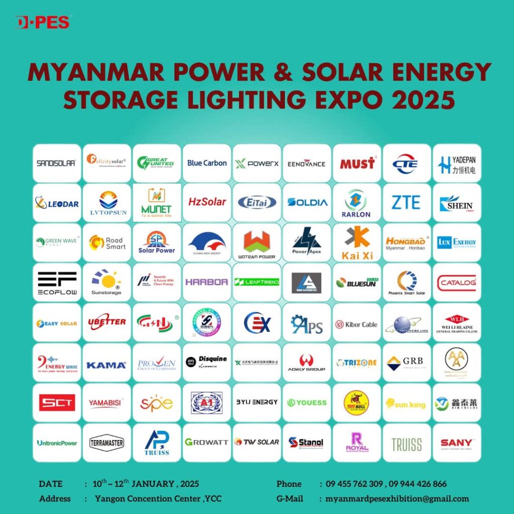 POWER & POTOVOLTAIC ENERGY STORAGE LIGHTING EXPO 2025 မီးစက်နှင့် ဆိုလာစွမ်းအင်သိုလှောင်မှုကုန်စည်ပြပွဲကြီးကို Myanmar DPES Exhibition Co.,Ltd. မှ ပထမဦးဆုံးအကြိမ် ဦးဆောင်ကျင်းပသွားမည်ဖြစ်ပြီး နာမည်ကြီး ကုမ္ပဏီများဖြစ်သည့် Sundisolar, Glink, CTE, Leodar, Power X, Bluecarbon, A-Nature, Xinxin, Munet, HZsolar, SPECL, Soldia, Kama, Phonix, Energy, WOTEAM, Sunstorage, Eitai solar, LVtopsun, Solarpower, GW, KAIXI, CATALOG, Disquine, Easy, XINTAO, HLAING, DEEPAK, Ecoflow, RES, CHA, MEGA, WEI LI HLAING အစရှိသည့် Company ၇၀ ကျော်နှင့် လူကြိုက်အများဆုံးဖြစ်သည့် Solar Energy Storage ပစ္စည်းမျိုးစုံကိုလည်း တစ်နေရာထဲတွင် အစုံလင်ဆုံး လေ့လာ ဝယ်ယူနိုင်မည် ဖြစ်သည်။