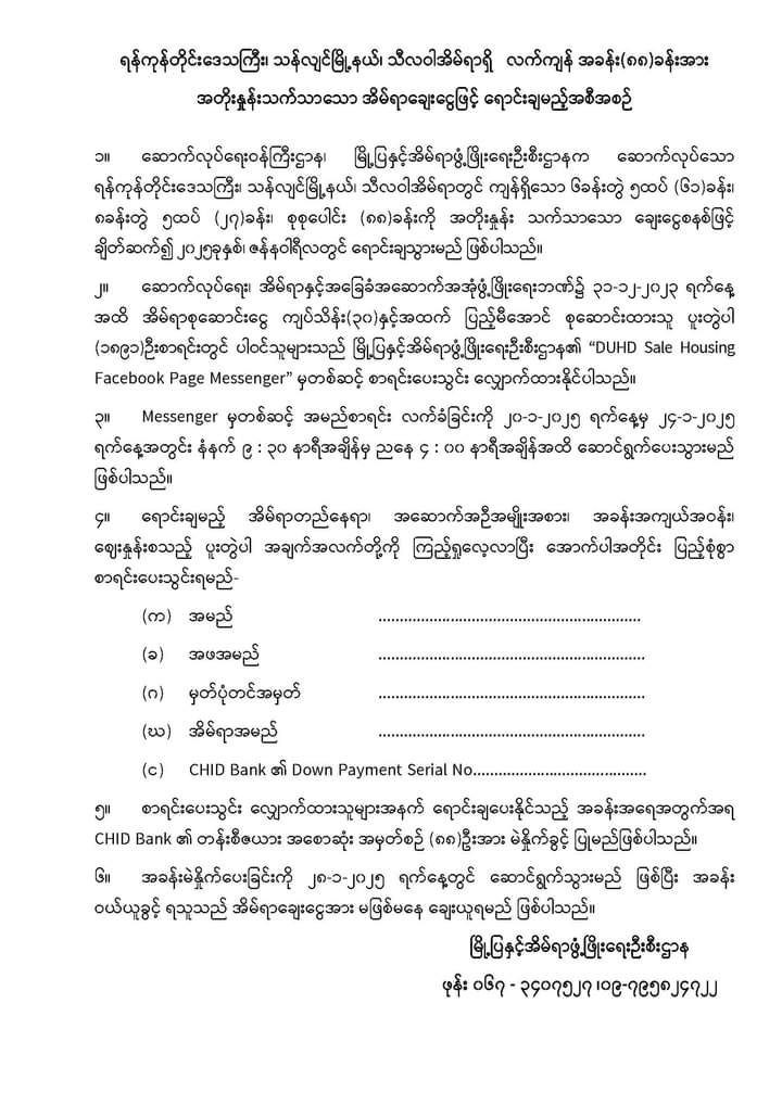 ထို့ပြင် Messenger မှတစ်ဆင့် အမည်စာရင်း လက်ခံခြင်းကို ၂၀၂၅ ခုနှစ်၊ ဇန်နဝါရီ ၂၀ ရက်မှ ၂၄ ရက်အတွင်း နံနက် ၉ နာရီခွဲမှ ညနေ ၄ နာရီအချိန်အထိ ဆောင်ရွက်ပေးသွားမည်ဖြစ်ပြီး ရောင်းချမည့် အိမ်ရာတည်နေရာ၊ အဆောက်အဦအမျိုးအစား၊ အခန်းအကျယ်အဝန်း၊ ဈေးနှုန်းစသည့် ပူးတွဲပါ အချက်အလက်တို့ကို ကြည့်ရှုလေ့လာပြီး အမည်၊ အဖအမည်၊ မှတ်ပုံတင်အမှတ်၊ အိမ်ရာအမည်၊ CHID Bank Down Payment Serial No တို့ကို ပြည့်စုံစွာ စာရင်းပေးသွင်းရမည်ဖြစ်ကြောင်း သိရသည်။