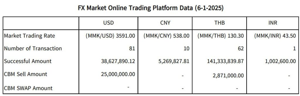 ယခု ၂၀၂၅ ခုနှစ် ဇန်နဝါရီ ၂ ရက်တွင် ဒေါ်လာ ၂၅ သန်း၊ ထိုင်းဘတ် ၂ ဒသမ ၄၅၈ သန်းနှင့် တရုတ်ယွမ် ၆၈၀,၀၀၀ ခန့်၊ ဇန်နဝါရီ ၃ ရက်တွင် တရုတ်ယွမ် ၅၁၀,၀၀၀ ကျော်နှင့် ယခုထပ်မံထုတ်ရောင်းပေးမှုအပါအဝင် ဇန်နဝါရီလ ပထမအပတ်အတွင်း ဒေါ်လာသန်း ၅၀၊ ထိုင်းဘတ် ၅ ဒသမ ၃၂၉ သန်းနှင့် တရုတ်ယွမ် ၁ ဒသမ ၂ သန်းနီးပါး ထုတ်ရောင်းပေးထားသည်။