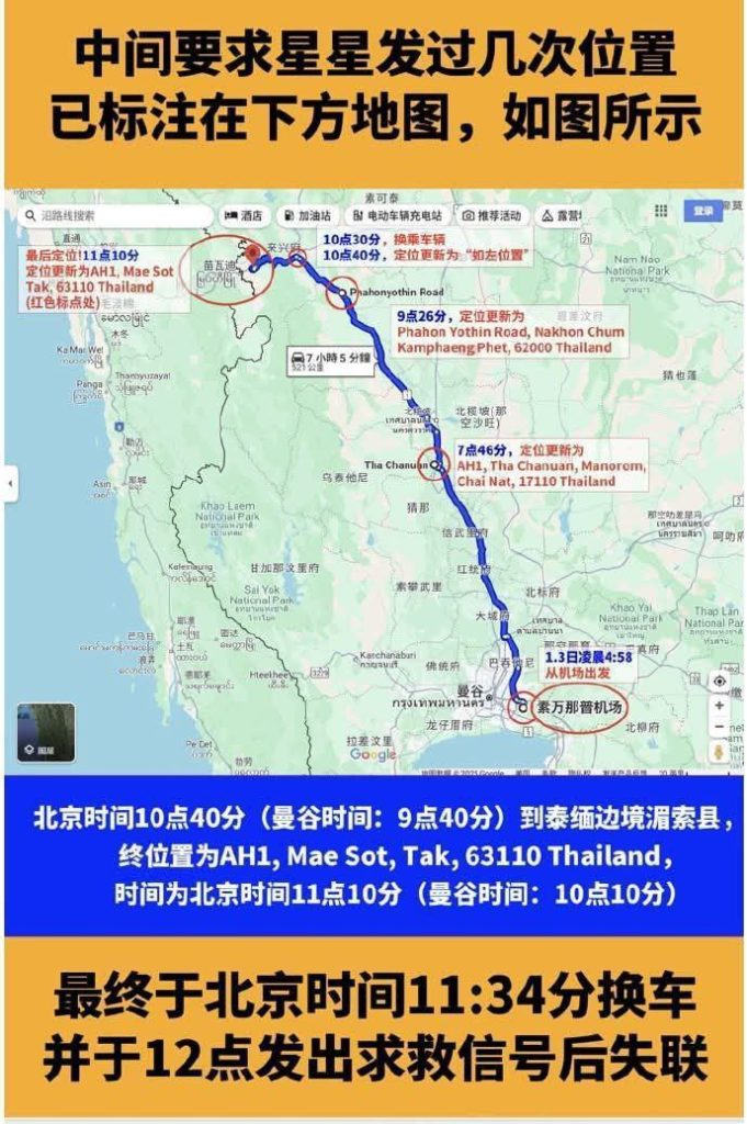 Xingxing ဟာ ဘန်ကောက်က သုဝဏ္ဏဘူမိလေဆိပ်ကို ၂၀၂၅ ခုနှစ် ဇန်နဝါရီ ၃ ရက် နံနက် ၃ နာရီမှာ ရောက်ရှိလာပြီး အဲဒီနေ့ ၁၀ နာရီခန့်မှာပဲ မဲဆောက်ကို ရောက်ရှိခဲ့တာလို့ ရဲမှူးကြီး Bowonpop က ပြောပြီး Xingxing ကို နောက်ဆုံးခြေရာခံမိတာက မဲဆောက်မဝင်မီ အဝိုင်းတစ်ခုအနီးဖြစ်သလို တရုတ်သတင်းဌာနတစ်ခုဖြစ်တဲ့ South China Morning Post က Xingxing ပျောက်ဆုံးမှုဟာ အွန်လိုင်းလိမ်လည်မှု ကျားဖြန့်လုပ်ငန်းတွေ နာမည်ကျော်တဲ့ မြဝတီမြို့အနီးမှာလို့ ပြောခဲ့ပါတယ်။ ချင်းမိုင်မြို့က တရုတ်ကောင်စစ်ဝန်ရုံးဟာလည်း မြန်မာနယ်စပ်အနီးမှာ တရုတ်သရုပ်ဆောင်တစ်ဦး ပျောက်ဆုံးသွားတဲ့ သတင်းထွက်ပေါ်အပြီးမှာ ထိုင်းနိုင်ငံက တရုတ်နိုင်ငံသားတွေ လုံခြုံရေးအတွက် အာမခံပေးမယ်လို့ ကတိပြုခဲ့တဲ့အပြင် မြန်မာနိုင်ငံတရုတ်သံရုံးကလည်း Xingxing ပျောက်ဆုံးနေမှုကို သိရှိထားကြောင်းနဲ့ Xingxing ဟာ မြဝတီကို ဝင်ရောက်မှုရှိမရှိကိုလည်း ချိတ်ဆက်စစ်ဆေးနေတယ်လို့ China Newsweek က ကနဦး ဖော်ပြအပြီးမှာ ထိုင်းအာဏာပိုင်တွေက Xingxing ဟာ မြန်မာနိုင်ငံဘက်ခြမ်းမှာ ပျောက်ဆုံးသွားတာလို့ ဇန်နဝါရီ ၆ ရက်မှာ အတည်ပြုခဲ့ကြတာပါ။