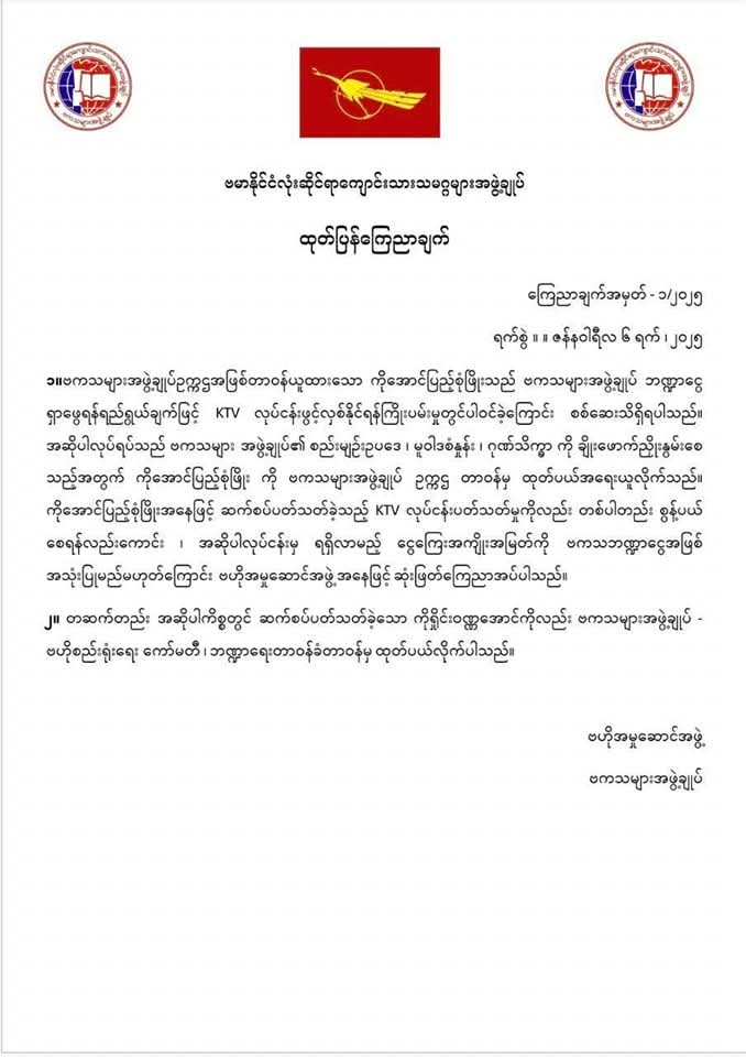 ဗကသများအဖွဲ့ချုပ် (ဗမာနိုင်ငံလုံးဆိုင်ရာ ကျောင်းသားသမဂ္ဂများအဖွဲ့ချုပ်) ဥက္ကဋ္ဌ အောင်ပြည့်စုံဖြိုးနဲ့ ဗဟိုစည်းရုံးရေးကော်မတီ ဘဏ္ဍာရေးတာဝန်ခံ ရှိုင်းဝဏ္ဏအောင်တို့ဟာ ရန်ပုံငွေရှာဖွေဖို့ ခေါင်းစဥ်တပ်ပြီး KTV ဖွင့်လှစ်ဖို့ ကြိုးပမ်းခဲ့တာကြောင့် တာဝန်ကနေ ထုတ်ပယ်အရေးယူလိုက်တယ်လို့ ဗကသများ အဖွဲ့ချုပ်က ထုတ်ပြန်လာပါတယ်။