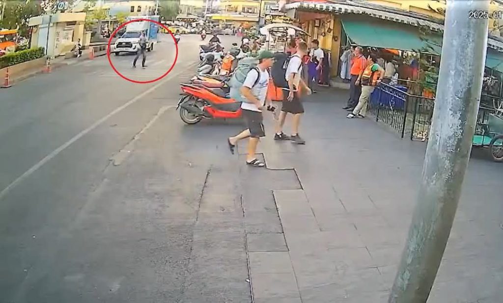 ပုံစာ။ ကျူးလွန်သူ ထိုင်းရေတပ်တပ်ကြပ်ဟောင်း M၊ လွတ်မြောက်နေသည့် ကမ္ဘောဒီးယားနိုင်ငံသားနဲ့ လုပ်ကြံခံရသူ Lim တို့မြင်ကွင်း။