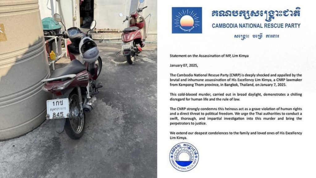 ကမ္ဘောဒီးယားနိုင်ငံရဲ့ အဓိက အတိုက်အခံအမတ်ဟောင်းဖြစ်ခဲ့သူ အသက် ၇၄ နှစ်အရွယ် Mr. Lim Kimya ကို ပစ်ခတ်မှုမှာ သံသယရှိတဲ့ ထိုင်းရေတပ်က တပ်ကြပ် M လို့ လူသိများသူ Ekkalak Paenoi ကို ၂၀၂၅ ခုနှစ် ဇန်နဝါရီလ ၈ ရက်နေ့က ကမ္ဘောဒီးယားနိုင်ငံမှာ ဖမ်းဆီးရမိခဲ့ပါတယ်။