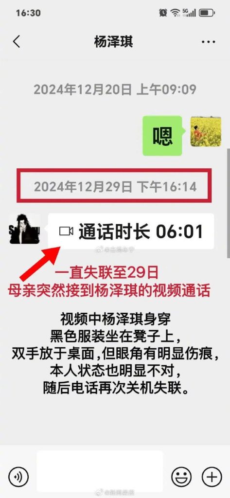 ဒီဇင်ဘာ ၂၁ ရက်မှာ Yang ဟာ သူငယ်ချင်းတစ်ဦးထံ မြန်မာနိုင်ငံဘက် ရောက်တော့မှာဖြစ်ကြောင်း ဝမ်းနည်းကြေကွဲစွာ မက်ဆေ့ချ်ပို့အပြီး အဆက်အသွယ်ပြတ်တောက်သွားခဲ့တာပါ။ အဲဒီနောက် ဒီဇင်ဘာလ ၂၉ ရက်နေ့မှာ သူဘေးကင်းကြောင်းကို သူ့မိခင်ထံ ဗီဒီယိုကောလ် ခေါ်ဆိုမှုတစ်ခု ပြုလုပ်ခဲ့ရာမှာ ဗီဒီယိုထဲမှာ သူက အနက်ရောင်ဝတ်စုံကို ၀တ်ဆင်ထားပြီး မျက်လုံးအနီးမှာ မြင်နိုင်တဲ့ ဒဏ်ရာတွေ ရှိနေပါတယ်။ အဲဒီနောက်မှာတော့ သူ့ဖုန်းက ပိတ်သွားခဲ့ပြီး အဲဒီကတည်းက အဆက်အသွယ်ထပ်မရတော့တာပါ။