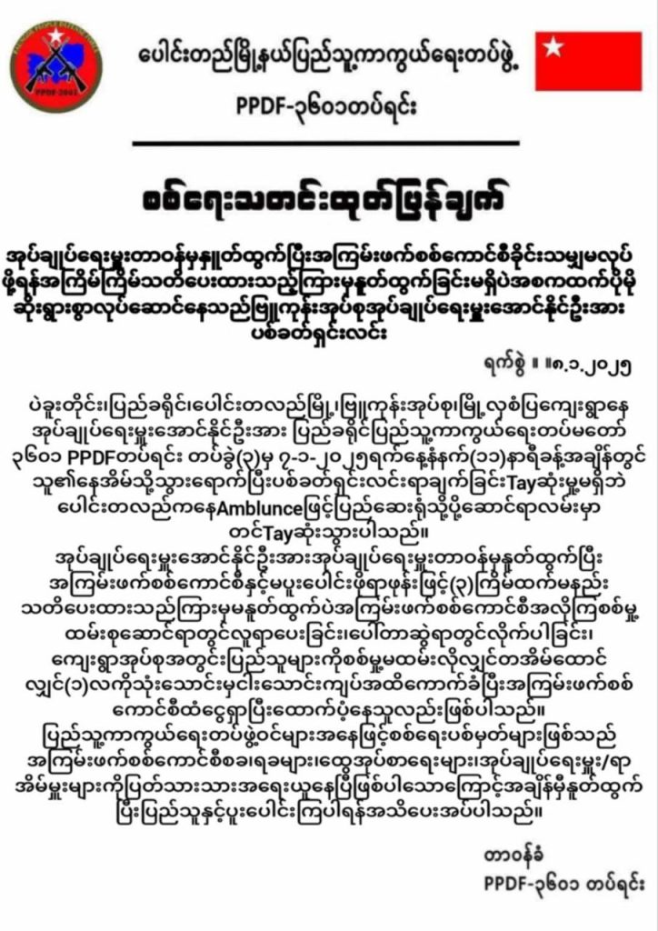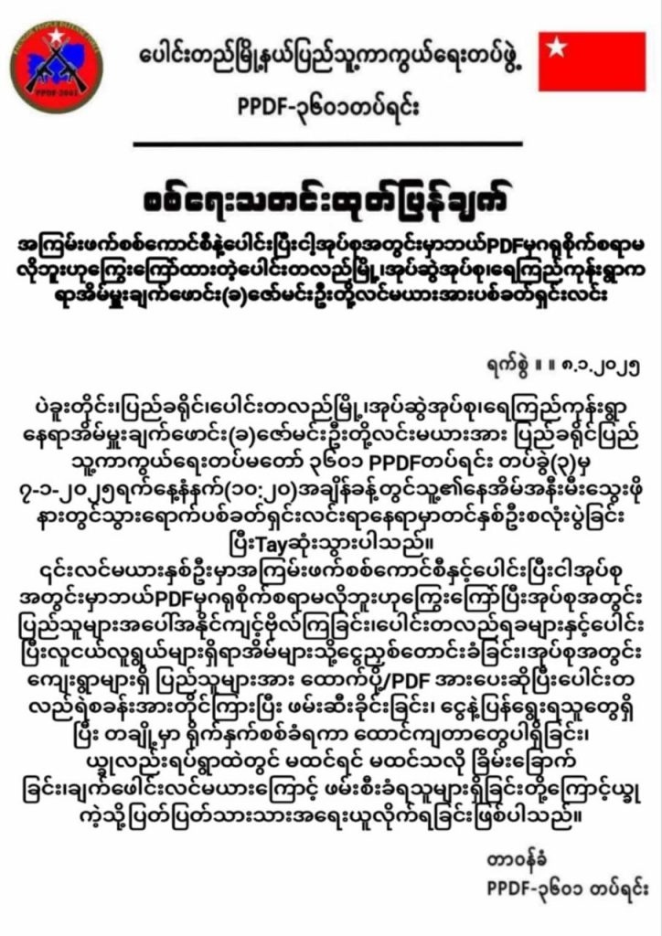 ဖြစ်စဉ်တွေက ၂၀၂၅ ခုနှစ်၊ ဇန်နဝါရီလ ၇ ရက်နေ့ နေ့လယ် ၁၂ နာရီ ၅ မိနစ် ပဲခူးတိုင်းဒေသကြီး၊ ပြည်မြို့နယ်၊ ရေကြည်ကုန်းကျေးရွာမှာ သေနတ်နဲ့ ပစ်ခတ်ခံရလို့ အမျိုးသားတစ်ဦးနဲ့ အမျိုးသမီးတစ်ဦး သေဆုံးသွားကြောင်း သတင်းအရ လုံခြုံရေးတပ်ဖွဲ့ဝင်တွေက သွားရောက်စစ်ဆေးခဲ့ရာမှာ အဆိုပါ ကျေးရွာနေ ဆယ်အိမ်မှူး ဦးဇော်မင်းဦး(ခ)ဦးချစ်ကို(ခ)ချက်ဖောင်း (၄၀)နှစ်ဟာ ဇနီးဖြစ်သူ ဒေါ်ဇာဖြူနှင်း (၃၀) နှစ်နဲ့အတူ နေအိမ်မှာ ရှိနေချိန် PDF လေးဦးက ဆိုင်ကယ်နှစ်စီးနဲ့ ရောက်ရှိလာပြီး သေနတ်နဲ့ ပစ်ခတ်သတ်ဖြတ်သွားခဲ့လို့ ဇနီးမောင်နှံနှစ်ဦးစလုံး ကျည်ထိမှန်ဒဏ်ရာများစွာရရှိကာ သေဆုံးသွားခဲ့တာပါ။ ဒါ့အပြင် မွန်းလွဲ ၁ နာရီ ၁၀ မိနစ်မှာ ပြည်မြို့နယ်၊ မြို့လှကျေးရွာနေ ရာအိမ်မှူးဖြစ်သူ ဦးအောင်နိုင်ဦး(၅၀)နှစ်ဟာ နေအိမ်မှာရှိနေချိန် PDF ခြောက်ဦးက ဆိုင်ကယ်သုံးစီးနဲ့ ရောက်ရှိလာပြီး သေနတ်နဲ့ ပစ်ခတ်သတ်ဖြတ်သွားလို့ ကျည်ထိမှန်ဒဏ်ရာများစွာ ရရှိကာ သေဆုံးသွားခဲ့တာပါ။ ဒီလူသုံးဦးသတ်ဖြတ်မှုကိုတော့ ပေါင်းတည် PDF အဖွဲ့ဖြစ်တဲ့ ပြည်ခရိုင်၊ ပြည်သူ့ကာကွယ်ရေးတပ်မတော်၊ PPDF ၃၆၀၁ တပ်ရင်း၊ တပ်ခွဲ (၃) က သတ်ဖြတ်တာလို့လည်း ကျူးလွန်တဲ့ PDF တွေက ဝန်ခံထားပါတယ်။