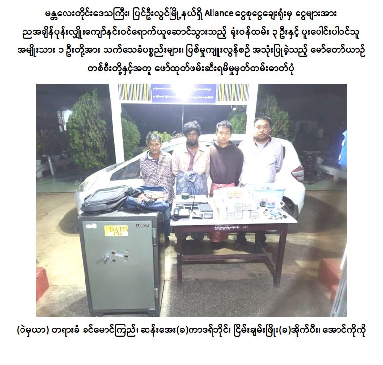 မန္တလေးတိုင်းဒေသကြီး၊ ပြင်ဦးလွင်မြို့နယ်ရှိ Aliance ငွေစုငွေချေးရုံးမှ ငွေများအား အဆိုပါရုံးမှ ရုံးဝန်ထမ်း ၂ ဦး၊ ညစောင့် ၁ ဦးနှင့် သော့ဖျက်ပေးသူ အမျိုးသား ၁ ဦးတို့က ပူးပေါင်းစီစဉ် ရယူခဲ့ကြပြီးနောက် ထိုငွေများကို ဧည့်စာရင်းလာစစ်သည့်အဖွဲ့များမှ တံခါးဖျက်ယူဆောင်သွားခဲ့ခြင်းဖြစ်ကြောင်း လီဆယ်သတင်းပို့ခဲ့သည့် ဖြစ်စဉ်အား ဖော်ထုတ်ဖမ်းဆီးရမိခဲ့ပြီဖြစ်ကြောင်း သိရသည်။