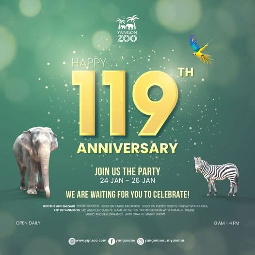 လာမယ့် ဇန်နဝါရီလ ၂၅ ရက်နေ့မှာ ကျရောက်မယ့်တိရစ္ဆာန်ဥယျာဉ် (ရန်ကုန်) ရဲ့ ၁၁၉ နှစ်ပြည့် အထိမ်းအမှတ်ပွဲတော်ကို၊ တိရစ္ဆာန်ဥယျာဉ် အတွင်းမှာ ဇန်နဝါရီလ ၂၄ ရက်နေ့ကနေ ၂၆ ရက်နေ့အထိ ၃ ရက်တိုင်တိုင် ပျော်ရွှင်စရာအစီအစဉ်များစွာနဲ့ စည်ကားသိုက်မြိုက်စွာ ကျင်းပသွားမှာ ဖြစ်ပါတယ်။