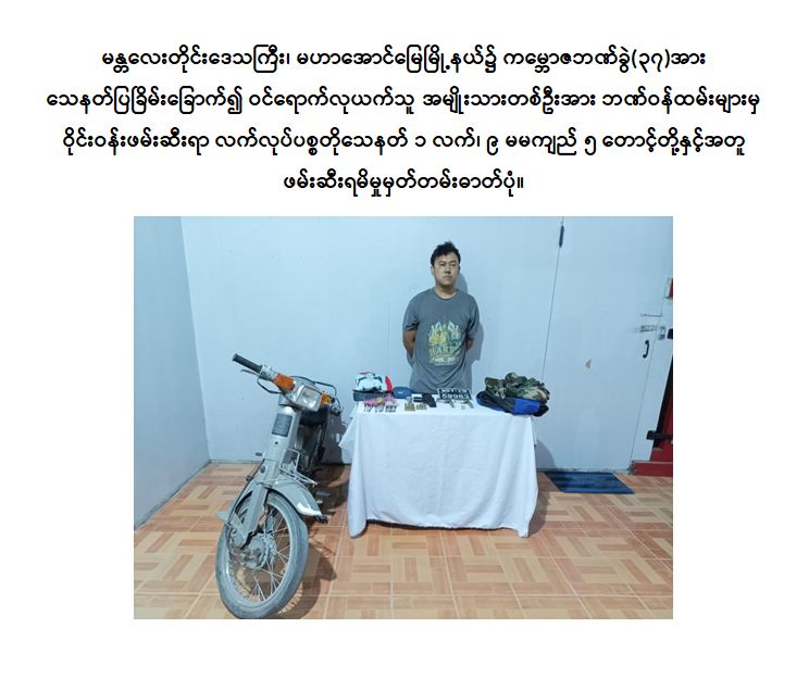 မန္တလေးတိုင်းဒေသကြီး၊ မဟာအောင်မြေမြို့နယ်၌ ကမ္ဘောဇဘဏ်ခွဲ(၃၇)အား သေနတ်ပြခြိမ်းခြောက်၍ ဝင်ရောက်လုယက်သူ အမျိုးသားတစ်ဦးအား ဘဏ်ဝန်ထမ်းများမှ ဝိုင်းဝန်းဖမ်းဆီးရာ လက်လုပ်ပစ္စတိုသေနတ် ၁ လက်၊ ၉ မမကျည် ၅ တောင့်တို့နှင့်အတူ ဖမ်းဆီးရမိခဲ့ကြောင်း သိရသည်။