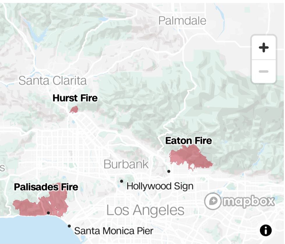 လော့စ်အိန်ဂျယ်လက်စ်ခရိုင်အတွင်း တောမီးလောင်ကျွမ်းမှု ခြောက်နေရာဖြစ်ခဲ့တဲ့အထဲမှာ Eaton နဲ့ Palisades ဝန်းကျင်ဒေသတွေမှာဖြစ်ခဲ့တဲ့တောမီးတွေက ကယ်လီဖိုးနီးယားပြည်နယ်ရဲ့ ဒုတိယမြောက်နဲ့ စတုတ္ထမြောက်ပျက်စီးဆုံးရှုံးမှု အများဆုံးတောမီးတွေလို့လည်းဆိုပါတယ်။ လက်ရှိလောင်ကျွမ်းနေဆဲ တောမီးသုံးခုဖြစ်တဲ့ Eaton, Palisades နဲ့ Hurst ဝန်းကျင်ဒေသတွေမှာလောင်ကျွမ်းမှုက စုစုပေါင်း ၆၀ စတုရန်းမိုင်ထက် ကျော်လွန်သွားပြီဖြစ်လို့ ပြင်သစ်နိုင်ငံမြို့တော်၊ ပါရီမြို့ထက်တောင် ပိုမိုကျယ်ပြန့်တဲ့ ပမာဏ ဖြစ်လာပြီလို့ သိရပါတယ်။
