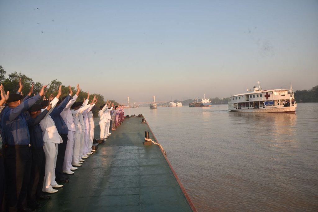 တပ်မတော်မြစ်တွင်းသွား ဆေးရုံရေယာဉ်(ရွှေပုဇွန်)နှင့် မြစ်ရေယာဉ်(စကု)တို့သည် ရန်ကုန်မြို့ အမှတ် (၄) ရေတပ်ဗောတံတားမှလည်းကောင်း၊ တပ်မတော်ပင်လယ်သွားဆေးရုံရေယာဉ်(သံလွင်)သည် ရန်ကုန်မြို့၊ အမှတ်(၂)ရေတပ် ဆိပ်ခံတံတား(သန်လျင်)မှလည်းကောင်း အသီးသီးထွက်ခွာကြရာ တပ်မတော်(ရေ)မှ အရာရှိကြီးများနှင့် အရာရှိ၊ စစ်သည်၊ မိသားစုများက ပို့ဆောင်နှုတ်ဆက်ခဲ့ကြသည်။
