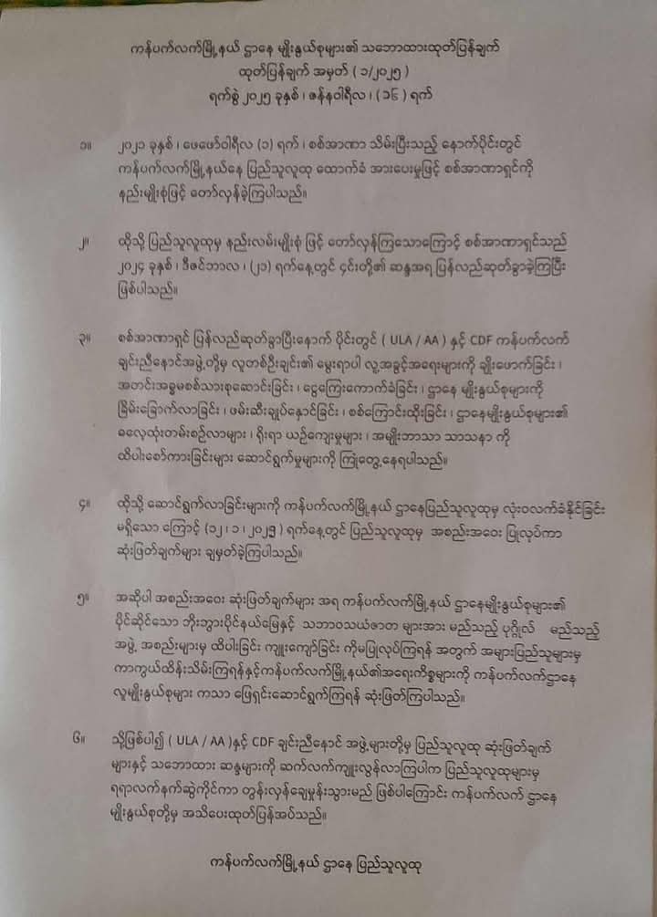 ဒါကြောင့် ရခိုင် ULA / AA နဲ့ CDF ချင်းညီနောင်အဖွဲ့တွေက ကန်ပက်လက် ပြည်သူလူထု ဆုံးဖြတ်ချက်နဲ့ သဘောထားဆန္ဒအပေါ် ဆက်လက်ကျူးလွန်လာရင် ချင်းပြည်သူလူထုက ရရာလက်နက်ဆွဲကိုင် တွန်းလှန်ချေမှုန်းသွားမှာဖြစ်တယ်လို့ ကန်ပက်လက်ဌာနေ မျိုးနွယ်စုက အသိပေးထုတ်ပြန်ထားပါတယ်။