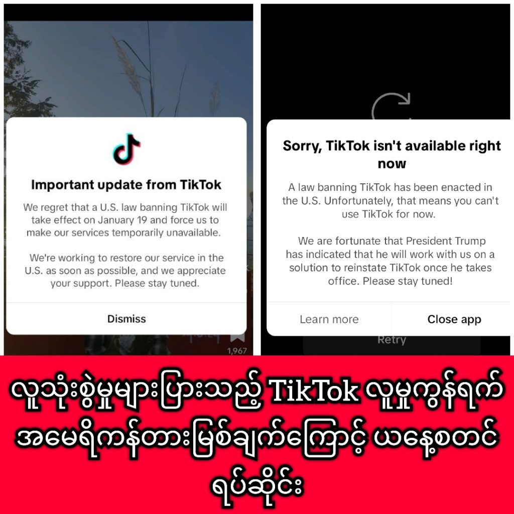 TikTok ဟာ မြန်မာနိုင်ငံမှာလည်း လူသုံးများတဲ့ လူမှုကွန်ရက်ဖြစ်ပြီး လူကြီးလူငယ်မရွေးနာမည်ကျော်ဖို့အသုံးချတဲ့ ကြားခံဆက်သွယ်ရေးကိရိယာအဖြစ်အသုံးချနေတာဖြစ်ပြီး အခုရပ်ဆိုင်းသွားတဲ့ TikTok ဟာ အမေရိကန်အပြင် မြန်မာနိုင်ငံမှာလည်း ဒီနေ့ကစ အသုံးပြုမရတော့ဘဲ “ဝမ်းနည်းပါတယ်။ Tik Tok ကို ယခု အသုံးပြုလို့ မရနိုင်ပါ။ အမေရိကန်မှာ TikTok ကို တားမြစ်တဲ့ ဥပဒေ ကံမကောင်းစွာနဲ့ ပြဋ္ဌာန်းလိုက်ပါတယ်။ ဒါကြောင့် သင်ဟာ အခုအချိန်မှာ TikTok ကို အသုံးမပြုနိုင်တော့ပါ။ ကံကောင်းထောက်မစွာနဲ့ ရွေးကောက်ခံသမ္မတ Trump က TikTok ကို ပြန်လည်နေရာချထားရေးအတွက် ဖြေရှင်းချက်တစ်ခုနဲ့ အတူ ပူးပေါင်းဆောင်ရွက်မယ်လို့ ညွှန်ပြထားပါတယ်။ စောင့်မျှော်ပေးပါ”လို့ ဖော်ပြခဲ့တာ တွေ့ရပါတယ်။