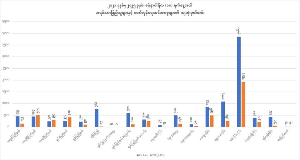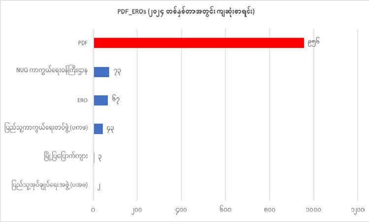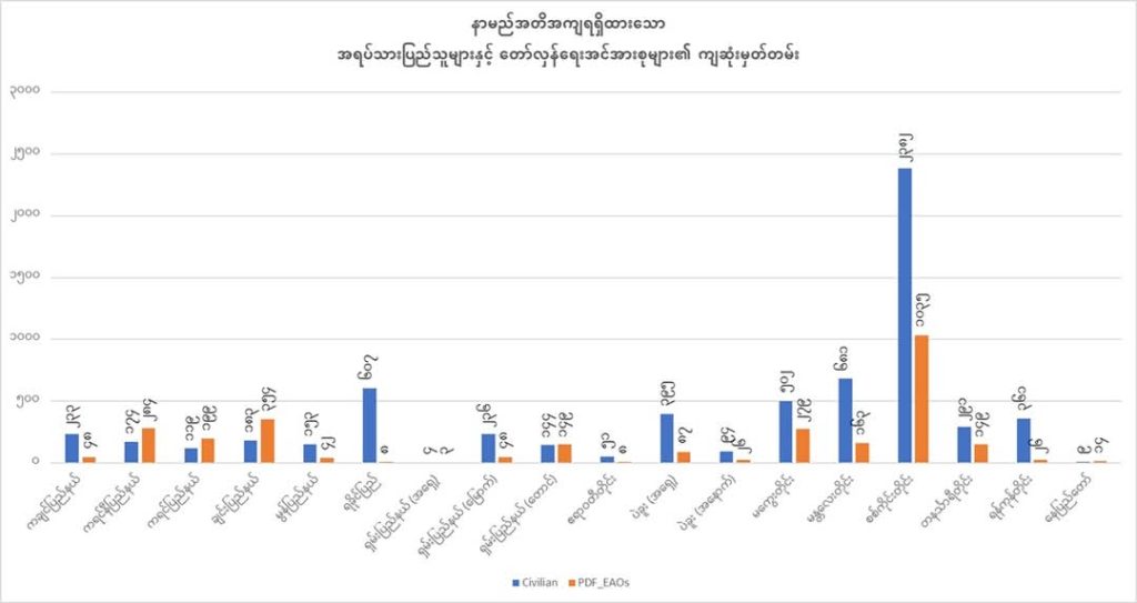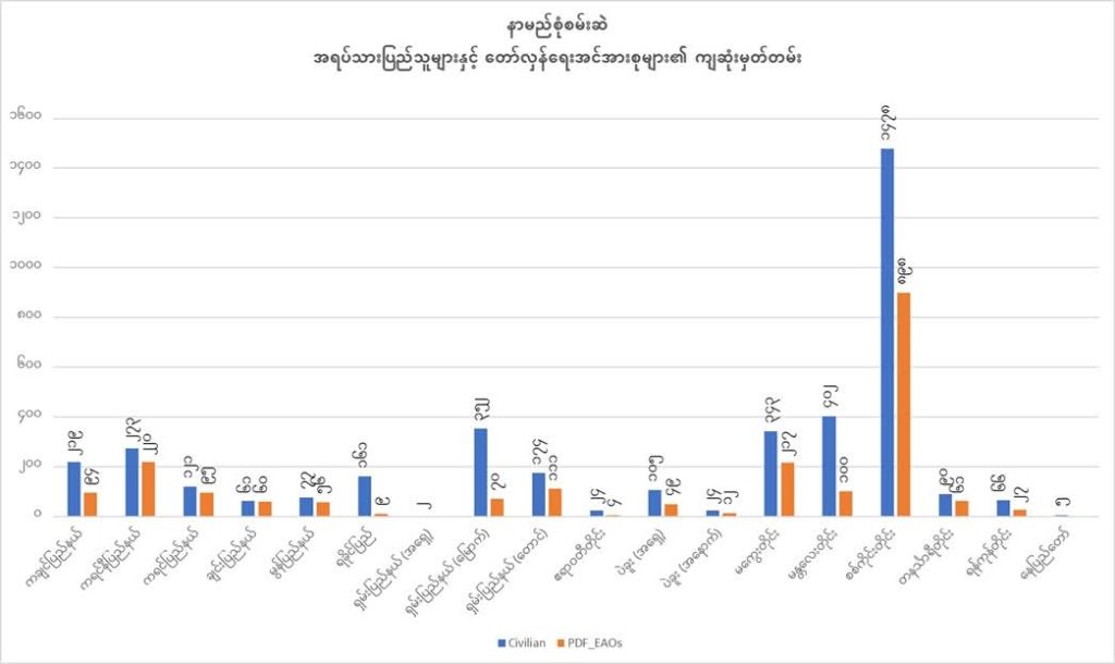 ဒါ့အပြင် ၂၀၂၄ ခုနှစ်အတွင်း သေဆုံးသူသီးသန့်စာရင်းအနေနဲ့ ပြည်သူ့ကာကွယ်ရေးတပ်ဖွဲ့ဝင် (၉၅၆)ဦး၊ NUG ကာကွယ်ရေး ဝန်ကြီးဌာန (၇၃)ဦး၊ ERO (၆၇) ဦး၊ ပြည်သူ့ကာကွယ်ရေးတပ်ဖွဲ့ (ပကဖ) (၄၃)ဦး၊ မြို့ပြပျောက်ကြား (၃)ဦး၊ ပြည်သူ့အုပ်ချုပ်ရေး (ပအဖ) (၂)ဦး အပါအဝင်စုစုပေါင်း(၁,၁၄၄)ဦး သေဆုံးသွားတယ်ပြောပါတယ်။
