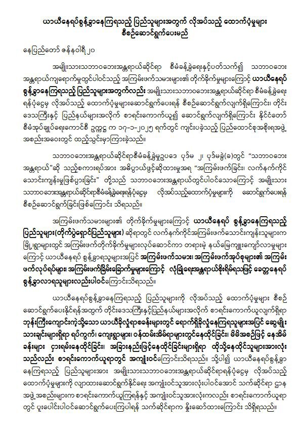 ယာယီနေရပ်စွန့်ခွာနေကြရသည့် ပြည်သူများကို လိုအပ်သည့် ထောက်ပံ့မှုများ စီစဉ် ဆောင်ရွက်ပေးနိုင်ရန်အတွက် တိုင်းဒေသကြီးနှင့်ပြည်နယ်များအလိုက် စာရင်းကောက်ယူလျက်ရှိရာ ဘုန်းကြီးကျောင်းကဲ့သို့သော ယာယီခိုလှုံရာစခန်းများတွင် ရောက်ရှိခိုလှုံနေကြရသူများအပြင် ဆွေမျိုးသားချင်းများရှိရာ ရပ်ကွက်၊ ကျေးရွာများ၊ ဝန်ထမ်းအိမ်ရာများတွင်နေထိုင်ခြင်း၊ မိမိအစဉ်ဖြင့် နေအိမ်ခန်းများ ငှားရမ်းနေထိုင်ခြင်း၊ အခြားနည်းဖြင့်နေထိုင်ခြင်းများရှိရာ ထိုသို့နေထိုင်သူများအားလုံးသည်လည်း စာရင်းကောက်ယူရာတွင် အကျုံးဝင်ကြောင်း သိရသည်။