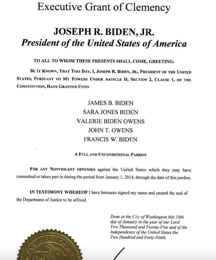 ဂျိုးဘိုင်ဒန်က သူတို့အနေနဲ့ အခြေအမြစ်မရှိဘဲ နိုင်ငံရေးအရ လှုံ့ဆော်မှုပြုတဲ့စုံစမ်းစစ်ဆေးမှုတွေအရ ပစ်မှတ်ထားခံခဲ့ရတယ်လို့ ဂျိုးဘိုင်ဒန်က ဆိုခဲ့ပါတယ်။ ထရန့်က သမ္မတ တာဝန်မယူမီ မိနစ်ပိုင်းအလိုမှာ ထုတ်ပြန်ခဲ့တဲ့ ဂျိုးဘိုင်ဒန်ရဲ့ အမိန့်ကြောင့် သူ့ရဲ့ညီ ဂျိမ်းစ်ဘိုင်ဒန်၊ ဇနီးဖြစ်သူ ဆာရာဂျုံးစ်ဘိုင်ဒန်၊ ဂျိုးဘိုင်ဒန်ရဲ့ ညီမ ဗီလီရီ ဘိုင်ဒန် အိုဝင်စ်၊ အိုဝင်စ်ရဲ့ ခင်ပွန်း ဂျွန် အိုဝင်စ်နဲ့ ညီဖြစ်သူ ဖရန်စစ် ဘိုင်ဒန်တို့အနေနဲ့ လွတ်ငြိမ်းချမ်းသာခွင့်ရကြမှာပါ။