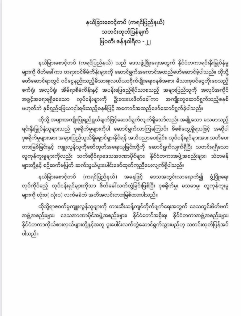 နယ်ခြားစောင့်တပ် (ကရင်ပြည်နယ်) အနေဖြင့် ဒေသအတွင်းလာရောက်၍ ဖွံ့ဖြိုးရေး လုပ်ကိုင်မည့်လုပ်ငန်းရှင်များကိုသာ ဖိတ်ခေါ်လက်တွဲခြင်းဖြစ်ပြီး ဒုစရိုက်မှု၊ မသမာမှု၊ လူကုန်ကူးမှုများကို လုံးဝ( လုံးဝ) လက်မခံဘဲ အတိအလင်းတားမြစ်ထားသည်ဟုလည်း ထုတ်ပြန်ချက်က ဆိုသည်။