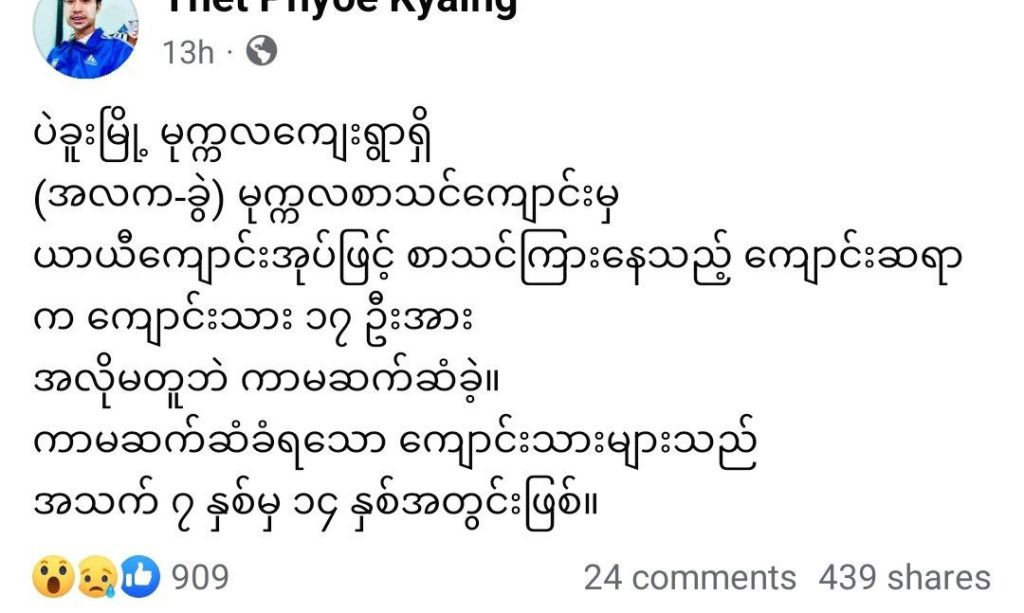 ပုံစာ။ ကျောင်းသားငယ်များကို အဓမ္မပြုကျင့်သည့် တာဝန်ခံကျောင်းအုပ်ဆိုသူနှင့် ဖြစ်စဥ်ကိုဖော်ပြထားသည့် ကျောင်းဆရာတစ်ဦး၊ ပြန်ဆက်မှသတင်းထောက်တစ်ဦးနှင့် ဖြစ်စဥ်ဖော်ပြသည့် ပို့စ်များမှဖြစ်ပြီး အဆိုပါ ဖြစ်စဥ်မှန်ကန်ကြောင်း ပဲခူးမြို့မရဲစခန်းမှ အတည်ပြုချက်ရချိန်တွင် MT News က မျက်နှာဖော်ပြပေးမည်ဖြစ်သည်။