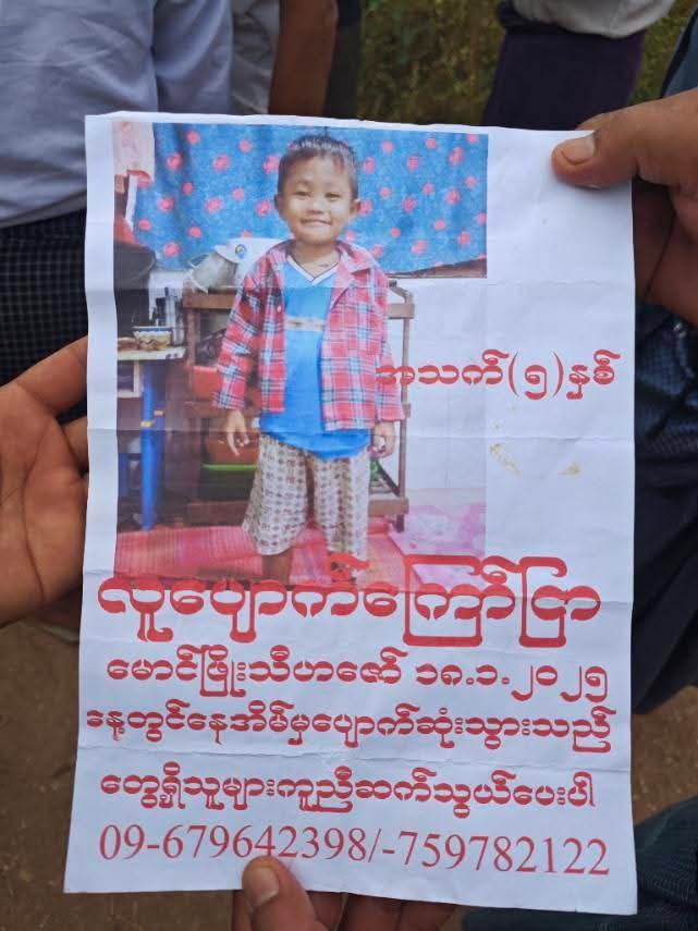 ရန်ကုန်မြို့ ၊ ရွေပေါက္ကံ (၁၁)ရပ်ကွက်က ကလေးပျောက်နေကြောင်း လူမှုကွန်ရက်ပေါ်တင်ကာ ရှာဖွေနေတဲ့ အသက် ငါးနှစ်အရွယ် သားငယ် ပျောက်ဆုံးပြီး ရှစ်ရက်မြောက်နေ့မှာ အိမ်အနီး ရေကာတာအတွင်း ရေနစ်သေဆုံးလျှက်သား ဒီနေ့ ဇန်နဝါရီ၂၆ ရက်နေ့ မနက်ပိုင်းက ပြန်လည်တွေ့ရှိတယ်လို့ မြေပြင်အကူအညီ သွားရောက်ခဲ့တဲ့ ထာဝရ အလင်းတန်း လူမှုကူညီရေးအသင်းထံကနေ သိရပါတယ်။