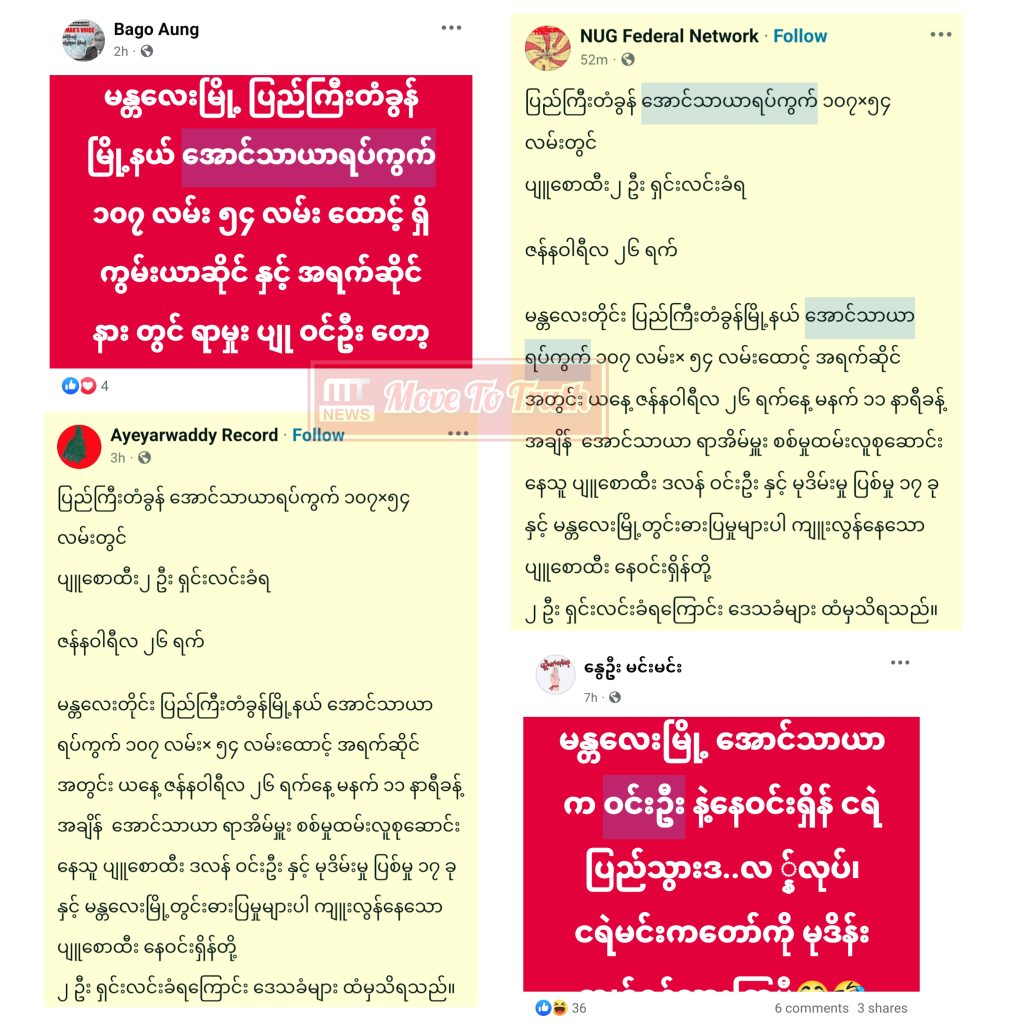 မန္တလေးမြို့၊ ချမ်းမြသာစည်မြို့နယ်၊ အောင်သာယာရပ်ကွက် အကွက်မှုးဖြစ်သူ ရာအိမ်မှူး ဦးဝင်းဦးအား PDF နှစ်ဦးက ပစ်ခတ်သတ်ဖြတ်မှု ယနေ့ဖြစ်ပွားခဲ့သလို ဦးဝင်းဦးနှင့် အတူထိုင်နေသူ အမျိုးသားတစ်ဦးမှာလည်း ပခုံးကျည်ဖောက်ဝင်ဒဏ်ရာရရှိမှုဖြစ်ပွားခဲ့သည်ဟု သိရသည်။