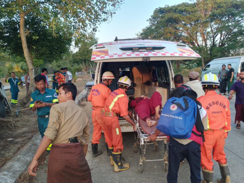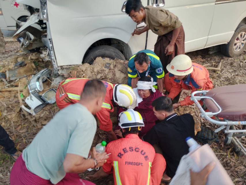 ယာဥ်တိုက်မှုကြောင့် ယာဥ်မောင်းဖြစ်သူ အသက် ၃၁ နှစ်အရွယ် ဦးမျိုးမြင့်အောင်တွင် ဘယ်ခြေသလုံးကွဲဒဏ်ရာ၊ မေးစေ့ကွဲ၊ ဘယ်ဘက်လက်ဖျံပေါက်ပြဲပွန်းပဲ့ဒဏ်ရာတို့ရရှိခဲ့ပြီး ယာဥ်ရှေ့ခေါင်းခန်းတွင်လိုက်ပါလာသော အသက် ၅၈ နှစ်အရွယ် ဒေါ်မြင့်မြင့်ကြိုင်တွင် ညာဘက်ပေါင်ရိုးကျိုးဒဏ်ရာ၊ နဖူးချိုင့်ဝင်ပေါက်ပြဲဒဏ်ရာ၊ မေးစေ့ပေါက်ပြဲဒဏ်ရာ၊ ညာလက်နာကျင်ဒဏ်ရာတို့ရရှိခဲ့ရာ လူနာမှာအသက်အန္တရာယ် စိုးရိမ်ရကြောင်း သိရသည်။