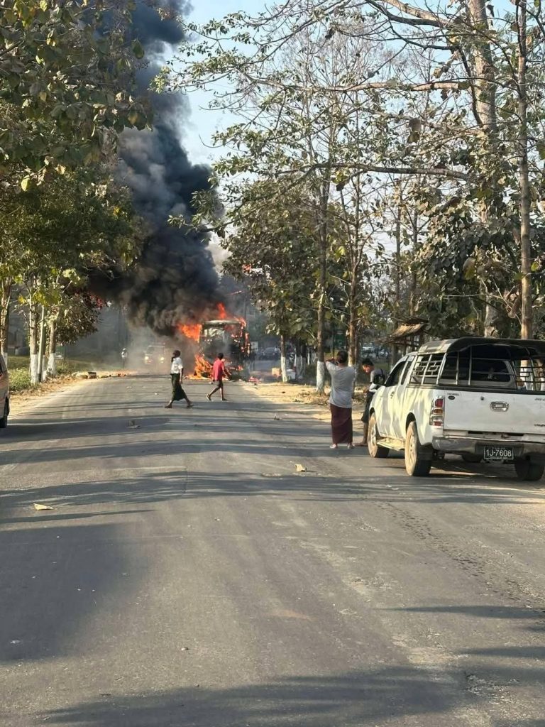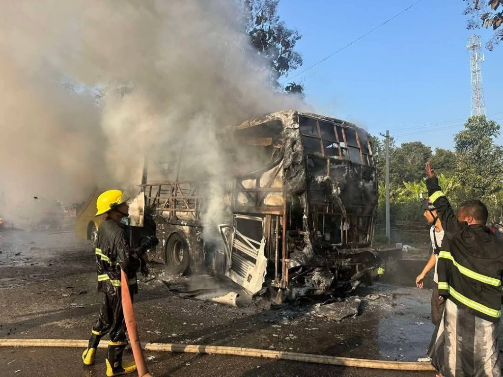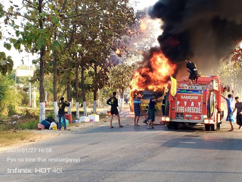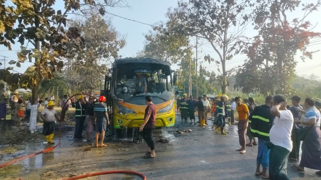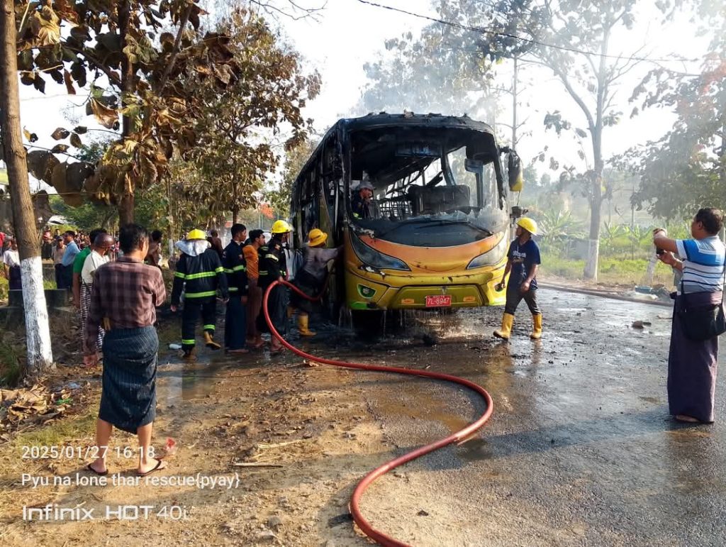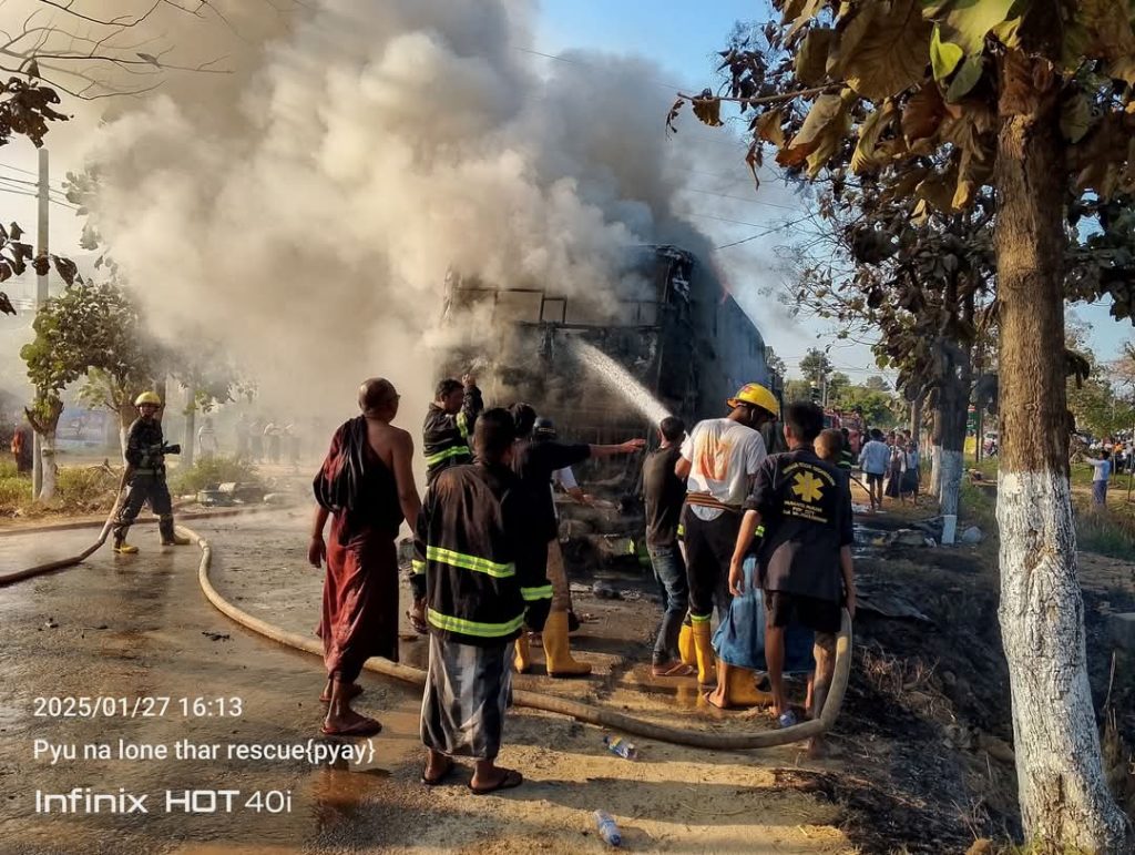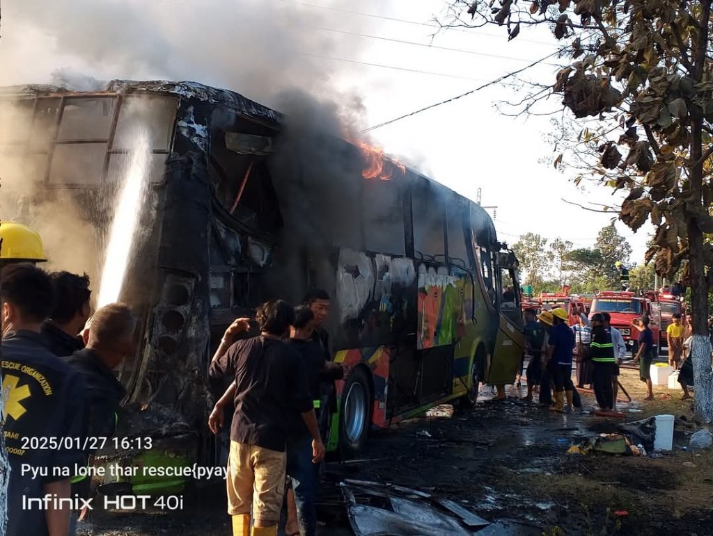 “ဖြစ်သွားတာက မြို့ရှောင်လမ်းပေါ်က ရွှေဗျိုင်းဖြူဆီဆိုင်နားမှာ။ ကားက တစ်စီးလုံးလိုလို အကုန်လောင်ပြီးမှ ငြိမ်းသွားတာ။ ပေါက်ခေါင်း ရန်ကုန်ပြေးတဲ့ ဘုန်းမြတ်ပိုင်ယာဥ်လိုင်းကယာဥ်လို့ သိရပါတယ်” လို့ ကူညီပေးတဲ့ ပရဟိတသမားတစ်ဦးက ဆိုပါတယ်။