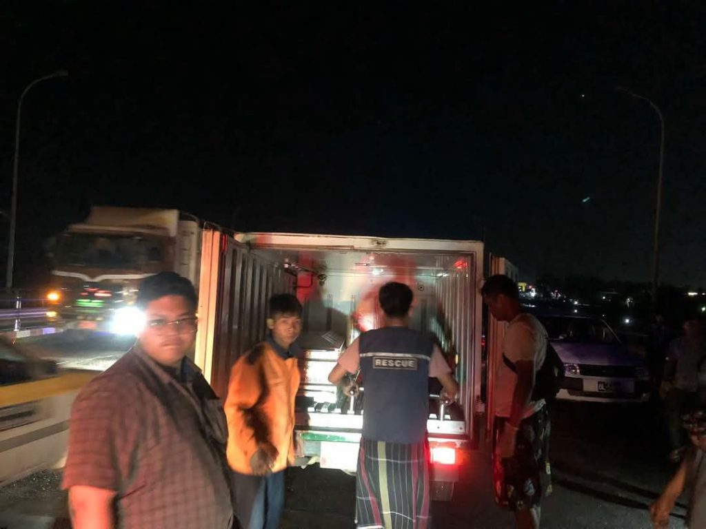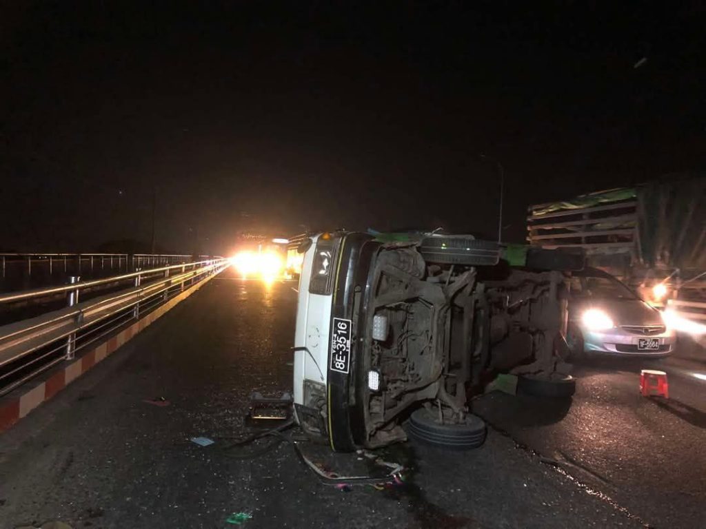 ရန်ကုန်တိုင်းဒေသကြီး၊ လှိုင်သာယာ (အရှေ့ပိုင်း) မြို့နယ်၊ ဘုရင့်နောင်တံတားအမှတ်(၂) လှိုင်သာယာဘက်အဆင်းတွင် လိုက်ထရက်ယာဥ်တစ်စီး တိမ်းမှောက်ရာမှ အမျိုးသားတစ်ဦးသေဆုံးပြီး ကိုယ်ဝန်ဆောင်သည်တစ်ဦး ထိခိုက်ဒဏ်ရာရရှိခဲ့ကြောင်း ကယ်ဆယ်ရေးဆောင်ရွက်ခဲ့သည့် မြတ်ကုသိုလ် လူမှုကူညီရေးအသင်းထံမှ သိရသည်။