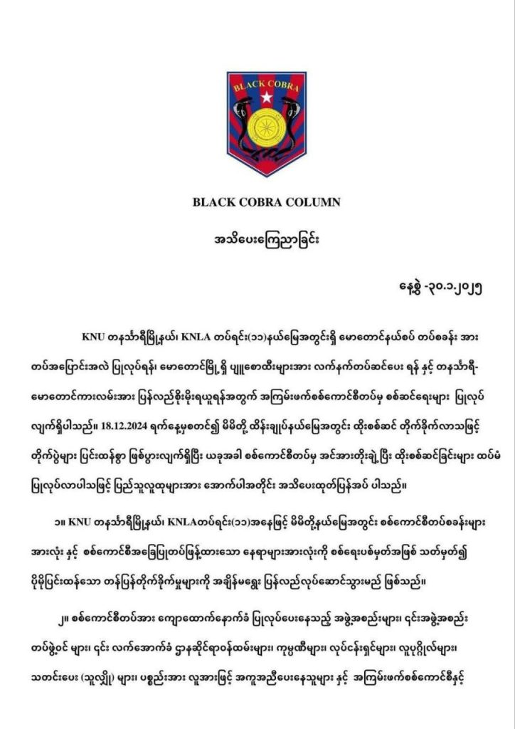 တနင်္သာရီမြို့နယ်ရှိ ပြည်သူများအား ကာလရှည် စစ်ရှောင်ရမည်ဟု KNLA ၏ Black Cobra Column က ခြိမ်းခြောက် အမိန့်ထုတ်ပြန်မှုကို ယမန်နေ့က ပြုလုပ်ခဲ့သည်။