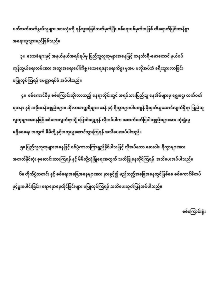 ထို့အပြင် ဒေသခံများနှင့် အနယ်နယ်အရပ်ရပ်မှ ပြည်သူလူထုများအနေဖြင့် တနင်္သာရီ-မောတောင် နယ်စပ်ကုန်သွယ်ရေးလမ်းအား အထူးအရေးပေါ်ကိစ္စ (သေရေး၊နာရေးကိစ္စ) မှအပ မလိုအပ်ဘဲ ခရီးသွားလာခြင်း မပြုလုပ်ကြရန်လည်း ခြိမ်းခြောက်စာတွင် ဖော်ပြထားသည်။
