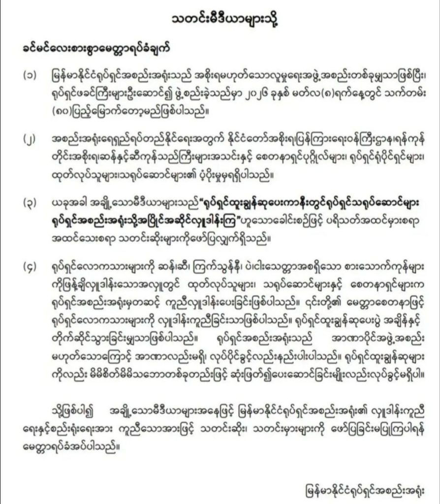တချို့သောမီဒီယာတွေအနေနဲ့ မြန်မာနိုင်ငံရုပ်ရှင်အစည်းအရုံးရဲ့ လှူဒါန်းကူညီရေးနဲ့ စည်းရုံးရေးကူညီတဲ့အနေနဲ့ သတင်းဆိုးသတင်းမှားတွေကို ဖော်ပြခြင်းမပြုကြဖို့လည်း ရုပ်ရှင်အစည်းအရုံးက မေတ္တာရပ်ခံထားပါတယ်။