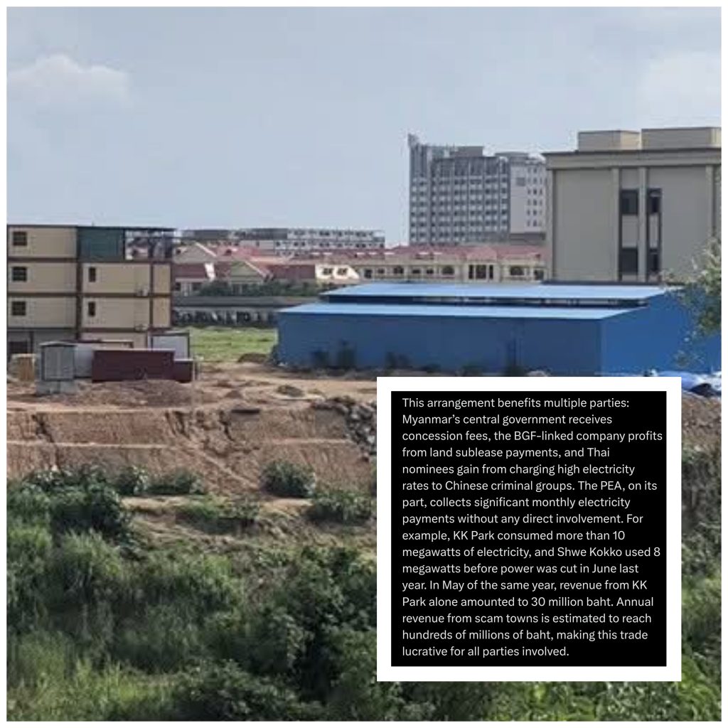 ထိုင်းနိုင်ငံက ပြည်နယ်လျှပ်စစ်အာဏာပိုင် (PEA)ဟာ မြန်မာနိုင်ငံဘက်က ဘုရားသုံးဆူ၊ တာချီလိတ်က နေရာနှစ်ခုနဲ့ မြဝတီဘက်က နေရာနှစ်ခု စုစုပေါင်း ၅ ခုတို့ကို လျှပ်စစ်ဓာတ်အားပေးနေတာဖြစ်ပြီး ဒီအထဲမှာ မြန်မာနိုင်ငံဘက်က ကျားဖြန့်ဂိုဏ်းတွေရှိရာဒေသတွေဆီကို ရောင်းချထားတဲ့ လျှပ်စစ်အဖိုးအခဟာ အခြားနိုင်ငံတွေဆီကို ရောင်းချထားမှုထက် များပြားနေတယ်လို့ ထိုင်းသတင်းတွေမှာ ဖော်ပြထားပြီး ၂၀၂၃ မေလမှာ ထိုင်းနိုင်ငံဟာ KNU ဥက္ကဋ္ဌ ပဒိုကွယ်ထူးဝင်းလက်မှတ်ရေးထိုးလုပ်ဆောင်နေတဲ့ တရုတ်ကျားဖြန့်ဂိုဏ်း KK Park တစ်ခုတည်းက ထိုင်းဘတ် သန်း ၃၀ ကျော် ရရှိခဲ့သလို ဒီကျားဖြန့်ဂိုဏ်းတွေဆီကနေ ထိုင်းနိုင်ငံဟာ လစဥ်ဘတ်သန်းရာချီ အကျိုးအမြတ်ရနေတယ်လို့လည်း ထိုင်းနိုင်ငံ ချင်းမိုင်တက္ကသိုလ် လူမှုဗေဒနဲ့ မနုဿဗေဒ ဌာနမှ တွဲဖက်ပါမောက္ခ Pinkaew Laungaramsri က ဝေဖန်ထားကြောင်း Thai Enquirer သတင်းဌာနက ဖော်ပြထားပါတယ်။