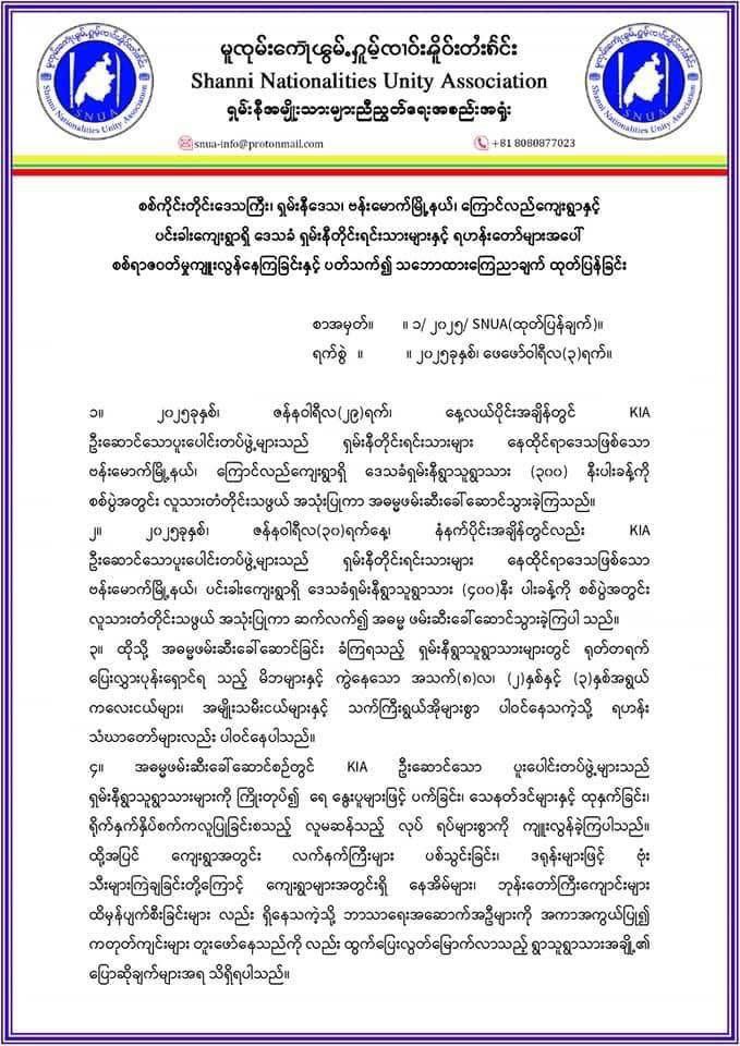 သို့ပါ၍ စစ်ကိုင်းတိုင်းဒေသကြီး၊ ရှမ်းနီဒေသ၊ ဗန်းမောက်မြို့နယ်၊ ကြောင်လည်ကျေးရွာနှင့် ပင်းခါးကျေးရွာတို့ရှိဒေသခံ ရှမ်းနီတိုင်းရင်းသားများနှင့် ရဟန်းတော်များအပေါ် စစ်ရာဇဝတ်မှုမြောက်သော ပြစ်မှုများကျူးလွန်နေကြသည့် ΚΙΑ ဦးဆောင်သော ပူးပေါင်းတပ်ဖွဲ့များ ကျူးလွန်ခဲ့ကြသည့် စစ်ရာဇဝတ်မှုများနှင့် ပတ်သက်၍ SNUA က အပြင်းအထန် ကန့်ကွက် ရှုတ်ချပြီး ၄င်းပြစ်မှုများအတွက် တာဝန်ယူမှု၊ တာဝန်ခံမှုပြုနိုင်စေရန် ကုလသမဂ္ဂဆိုင်ရာ အဖွဲ့အစည်းများ၊ နိုင်ငံတကာသံရုံးများ၊ လူ့အခွင့်အရေး ဆိုင်ရာအဖွဲ့အစည်းများ၊ အာဆီယံနှင့် နိုင်ငံတကာအသိုက်အဝန်းက ဝိုင်းဝန်းကူညီကြပါရန် လေးနက်စွာ တိုက်တွန်းတောင်းဆိုလိုက်သည်ဟုလည်း ထုတ်ပြန်ချက်တွင် ဖော်ပြထားသည်။