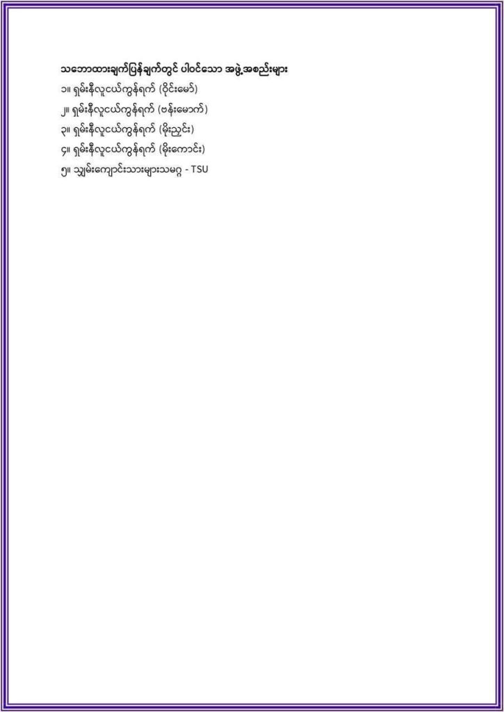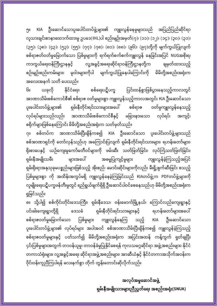 KIA ဦးဆောင်သောပူးပေါင်းတပ်ဖွဲ့များ၏ ကျူးလွန်နေမှုများသည် အပြည်ပြည်ဆိုင်ရာ လူသားချင်းစာနာထောက်ထားမှု ဥပဒေ(IHL)ပါ စည်းမျဉ်းအမှတ်(၇)၊ (၁၁)၊ (၁၂)၊ (၁၄)၊ (၃၀)၊ (၃၁)၊ (၃၅)၊ (၃၈)၊ (၄၃)၊ (၅၃)၊ (၅၅)၊ (၇၇)၊ (၇၈)၊ (၈၁)၊ (၈၈)၊ (၉၆)၊ (၉၇)တို့ကို မျက်ကွယ်ပြုလျက် စစ်ရာဇတ်ဝတ်မှုမြောက်သော ပြစ်မှုများကို ရက်ရက်စက်စက်ကျူးလွန်နေခြင်းအပြင် NUG ၏ ကာကွယ်ရေးဝန်ကြီးဌာနနှင့် လူ့အခွင့်အရေးဆိုင်ရာဝန်ကြီးဌာနတို့က ချမှတ်ထားသည့် စဉ်းမျဉ်းစည်းကမ်းများ၊ မူဝါဒများကိုပါ မျက်ကွယ်ပြုနေကြောင်းကို SNUA က အလေးအနက် သတိပေးသည်။