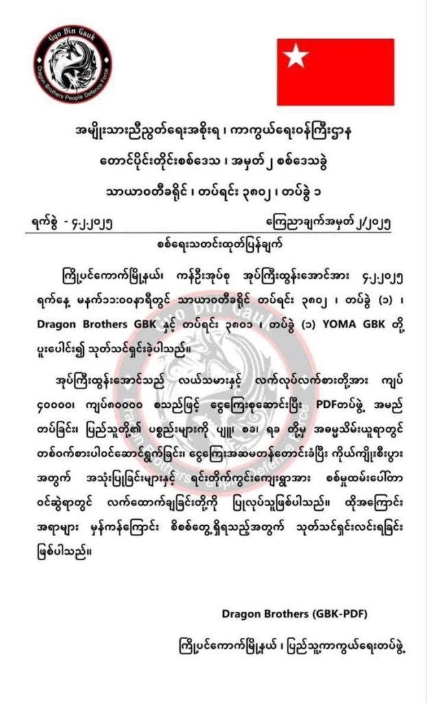 ပဲခူးတိုင်းဒေသကြီး၊ ကြို့ပင်ကောက်မြို့နယ်မှ လက်နက်မဲ့ ရပ်ကျေးအုပ်ချုပ်ရေးမှူးတစ်ဦးအား PDF နှစ်ဖွဲ့ပေါင်းကာ ယမန်နေ့ နံနက်ပိုင်းက သတ်ဖြတ်လိုက်ကြသည်ဟု ကျူးလွန်ရာတွင်ပါဝင်သည့် PDF အဖွဲ့တစ်ခုဖြစ်သော Dragon Brothers GBK PDF အဖွဲ့က ယနေ့တွင် ဝန်ခံလာသည်။