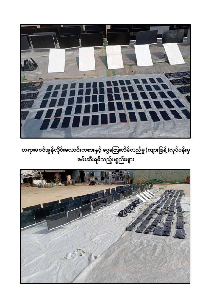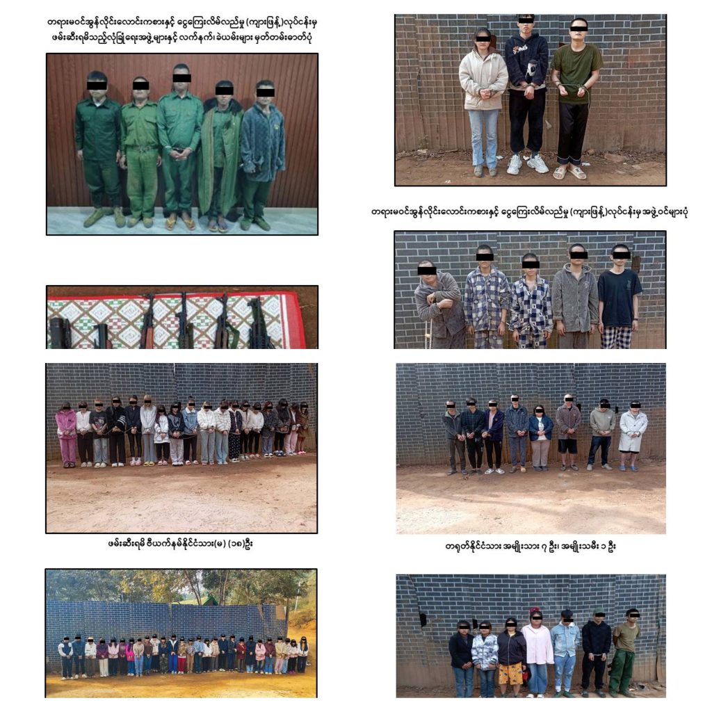“ဒီလ ဖေဖော်ဝါရီလ ၅ ရက်နေ့မှာ ရှမ်းပြည်နယ်၊ မိုင်းရယ်မြို့၊ မိုင်းဟဒေသအတွင်းမှာ ကျားဖြန့်လုပ်ငန်းတွေ ဆောင်ရွက်နေတယ်ဆိုတဲ့သတင်းအရ လုံခြုံရေးတပ်ဖွဲ့များဟာ သွားရောက်ပြီး နယ်မြေစစ်ဆေးမှုတွေ ဆောင်ရွက်ခဲ့ပါတယ်။ မိုင်းရယ်မြို့နယ်၊ မိုင်းခဒေသ နောင်ဟန်ရွာအနီးမှာ ကျားဖြန့်လုပ်ငန်းများ ဆောင်ရွက်နေတဲ့ ယာယီအဆောက်အအုံ ၇ လုံးကို တွေ့ရှိတဲ့အတွက် ဝင်ရောက်ပြီး ရှင်းလင်းခဲ့ရာမှာ လက်နက်များ၊ ခဲယမ်းများနဲ့အတူ ကျားဖြန့်လုပ်ငန်းမှာအသုံးပြုတဲ့ ဖုန်း ၁၈၁ လုံး၊ Laptop ၂၅ လုံး၊ Destop ၂၁ လုံး၊ key Board ၂၈ ခုနဲ့ Wifi စက်နှစ်လုံး၊ Starlink အင်တာနက်ဆက်သွယ်ရေးစက်နှစ်စုံနဲ့ ဆိုလာတွေ၊ ဘတ္ထရီတွေ ဖမ်းဆီးရမိခဲ့ပါတယ်။ တစ်ချိန်တည်း တစ်ပြိုင်တည်းမှာပဲ မိုင်းရယ်မြို့ အရှေ့တောင်ဘက် သတင်းရတဲ့နေရာသွားရောက်ရှင်းလင်းတဲ့အခါမှာ ကျားဖြန့်လုပ်ငန်းကို ကာကွယ်ပေးနေတဲ့ လက်နက်ကိုင် သောင်းကျန်းသူ ငါးဦးနဲ့ ပစ်ခတ်တာခံခဲ့ရပါတယ်။ မိမိဘက်ကလည်း ပြန်လည်ပစ်ခတ်ခဲ့ပါတယ်။ သေဆုံးဒဏ်ရာရရှိမှု အနည်းငယ်ရှိခဲ့ပါတယ်။ အဲဒီမှာတော့ တရုတ်နိုင်ငံသား ကျား ၇ ဦး၊ မ ၁ ဦး၊ မြန်မာနိုင်ငံသား ကျား ၈ ဦး၊ မ ၄ ဦးတို့ကို လက်နက် ၆ လက်နဲ့အတူ ဖမ်းဆီးရမိခဲ့ပါတယ်။ အဲဒီနယ်မြေကို ဖေဖော်ဝါရီလ ၆ ရက်နေ့မှာ အသေးစိတ်စစ်ဆေးမှုတွေ ဆောင်ရွက်ခဲ့ပါတယ်။ ဆောင်ရွက်ခဲ့တဲ့အခါမှာ မိုင်းတောင်ရဲ့ အနောက်တောင်ဘက် နေရာတစ်နေရာကနေ ထွက်ပြေးတိမ်းရှောင်နေတဲ့ တရုတ်နိုင်ငံသား ကျား ၃ ဦး၊ မ ၁ ဦး၊ ထပ်မံဖမ်းဆီးရမိခဲ့ပါတယ်။ အနောက်တောင်ဘက်ကိုပဲ ထပ်မံရှာဖွေတဲ့နေရာမှာ ထွက်ပြေးတိမ်းရှောင်နေတဲ့ ဗီယက်နမ်နိုင်ငံသား မ ၁၈ ဦး၊ မြန်မာနိုင်ငံသား ကျား ၂ ဦး၊ မ၂၅ ဦးနဲ့ စုစုပေါင်း ၄၅ ဦးတို့ကို ကွန်ပျူတာ ၇၂ လုံး၊ စတားလင့်အင်တာနက်စက် ၂၅ လုံး၊ ဖုန်းမျိုစုံ ၇၉လုံး၊ ငါးဂိမ်းစက် ၅လုံး၊ မော်တော်ယာဉ် နှစ်စီးတို့နဲ့အတူ ဖမ်းဆီးရမိခဲ့ပါတယ်။ ဖမ်းဆီးရမိသူများကို လိုအပ်တဲ့ စုံစမ်းစစ်ဆေးမှုများပြုလုပ်ပြီး လုပ်ထုံးလုပ်နည်းများတိုင်း ဆက်လက်ဆောင်ရွက်သွားမှာဖြစ်ပါတယ်” ဟု ဗိုလ်ချုပ်ဇော်မင်းထွန်းက ပြောကြားသည်။